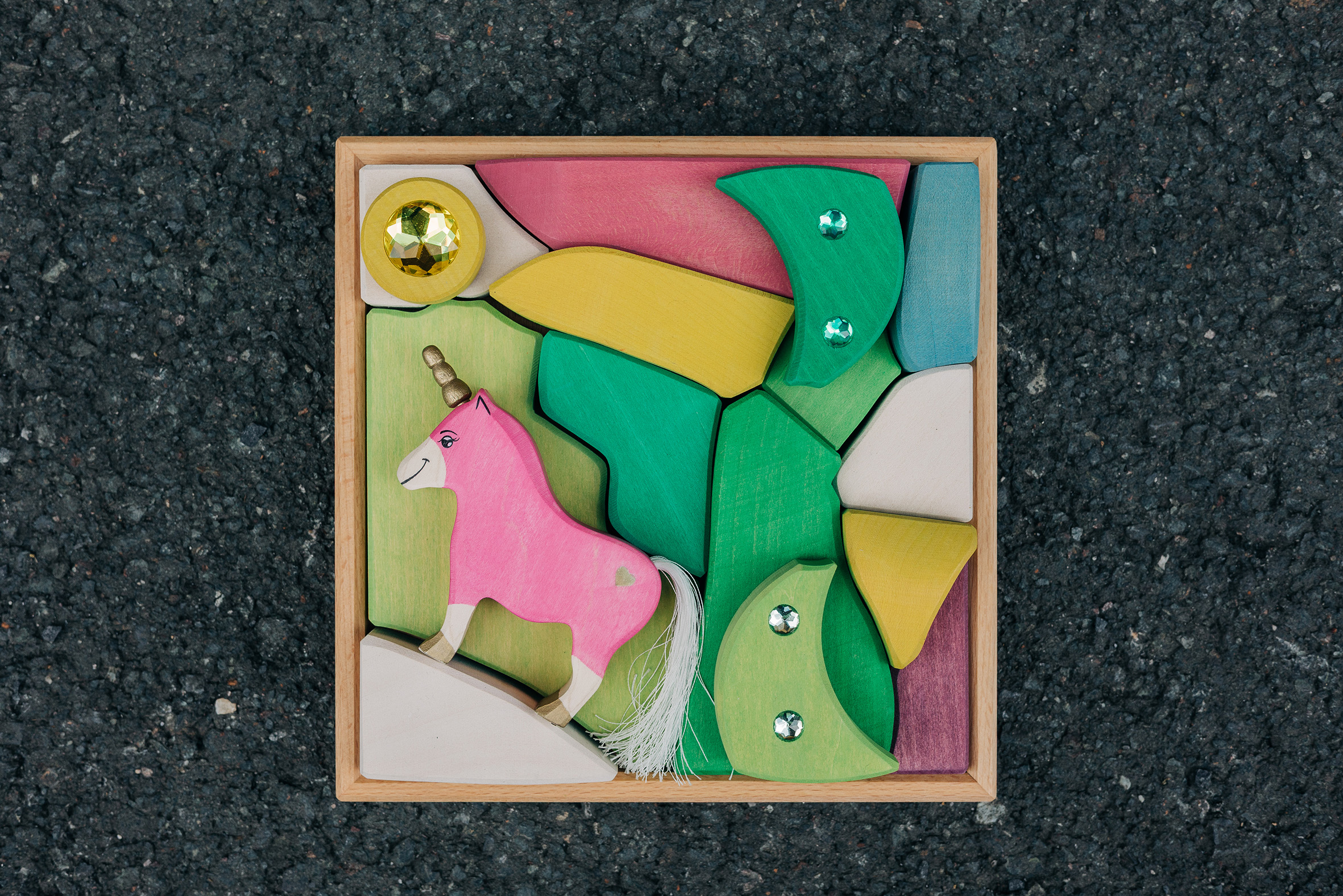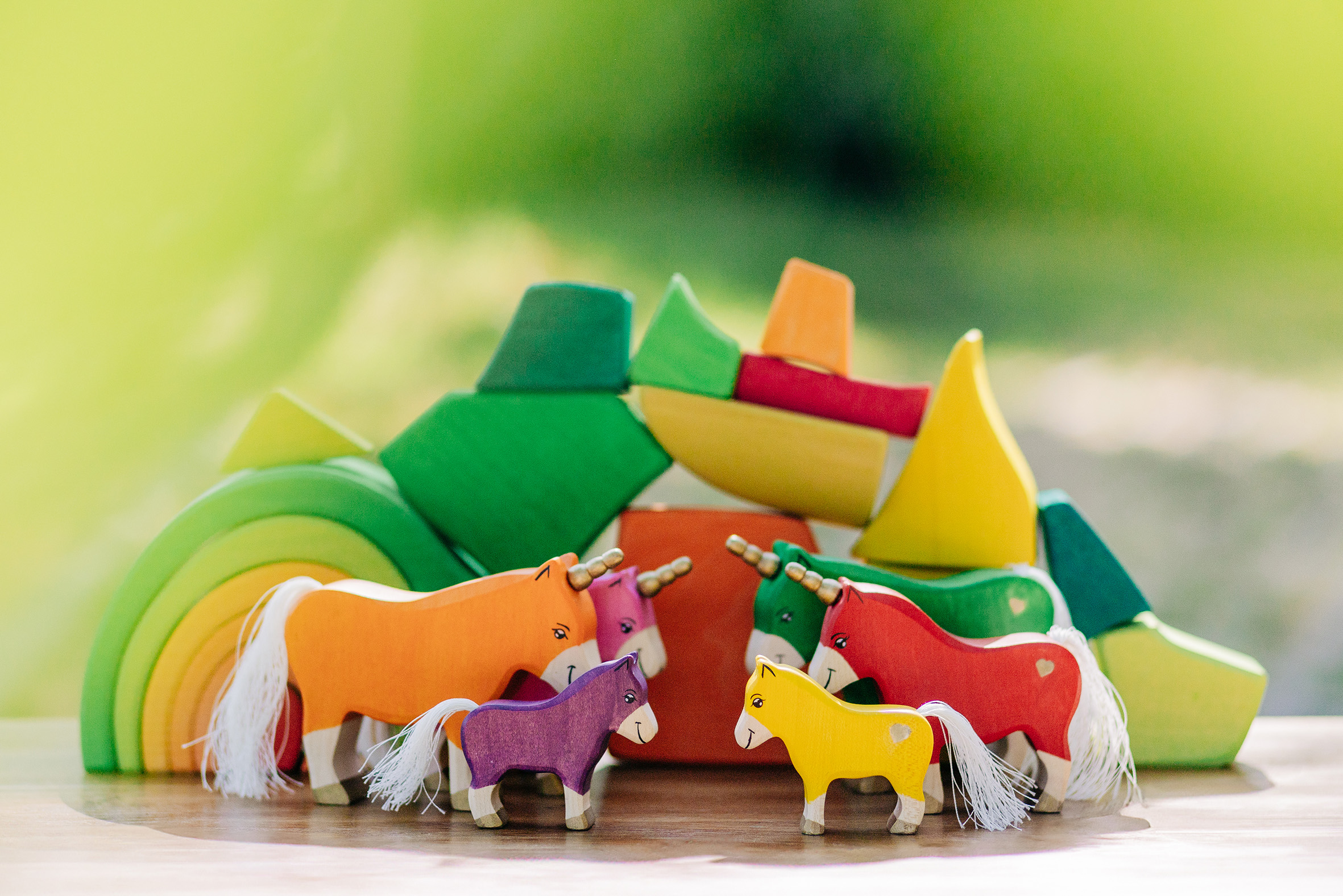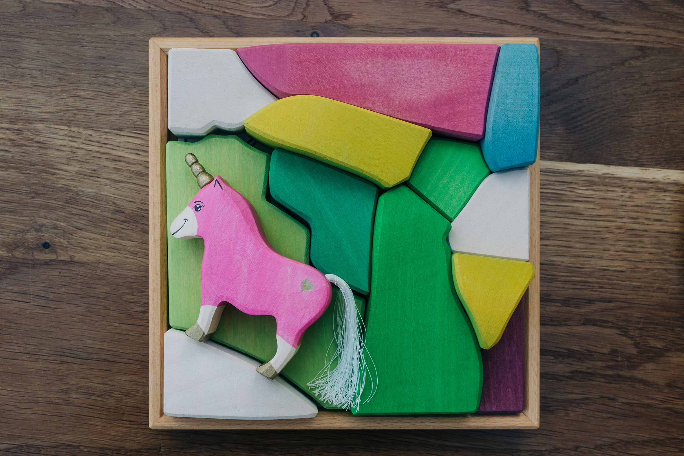 Willkommen in einer Welt voller Farben, Magie und unendlicher Fantasie! Unsere liebevoll handgefertigten Einhörner aus Holz laden Kinder dazu ein, in eine bunte Traumwelt einzutauchen, funkelnde Edelsteine und geheimnisvolle Abenteuer auf sie warten. Das stolze blaue Einhorn bewacht den Regenbogenpalast, während das goldene Einhorn neugierig durch die farbenfrohe Landschaft galoppiert. Und das zarte rosafarbene Einhorn bringt mit seiner Sanftheit eine Prise Zauber und Freundlichkeit in jede Geschichte. Begleitet werden die Fabelwesen von leuchtenden Holzbausteinen, die wie funkelnde Regenbogenkristalle wirken. Ob Türme, Regenbogenbrücken oder magische Höhlen – die bunten Elemente lassen sich immer wieder neu kombinieren und eröffnen unendliche Spielmöglichkeiten. Lass die Magie einziehen – entdecke jetzt unsere zauberhafte Einhorn-Welt!