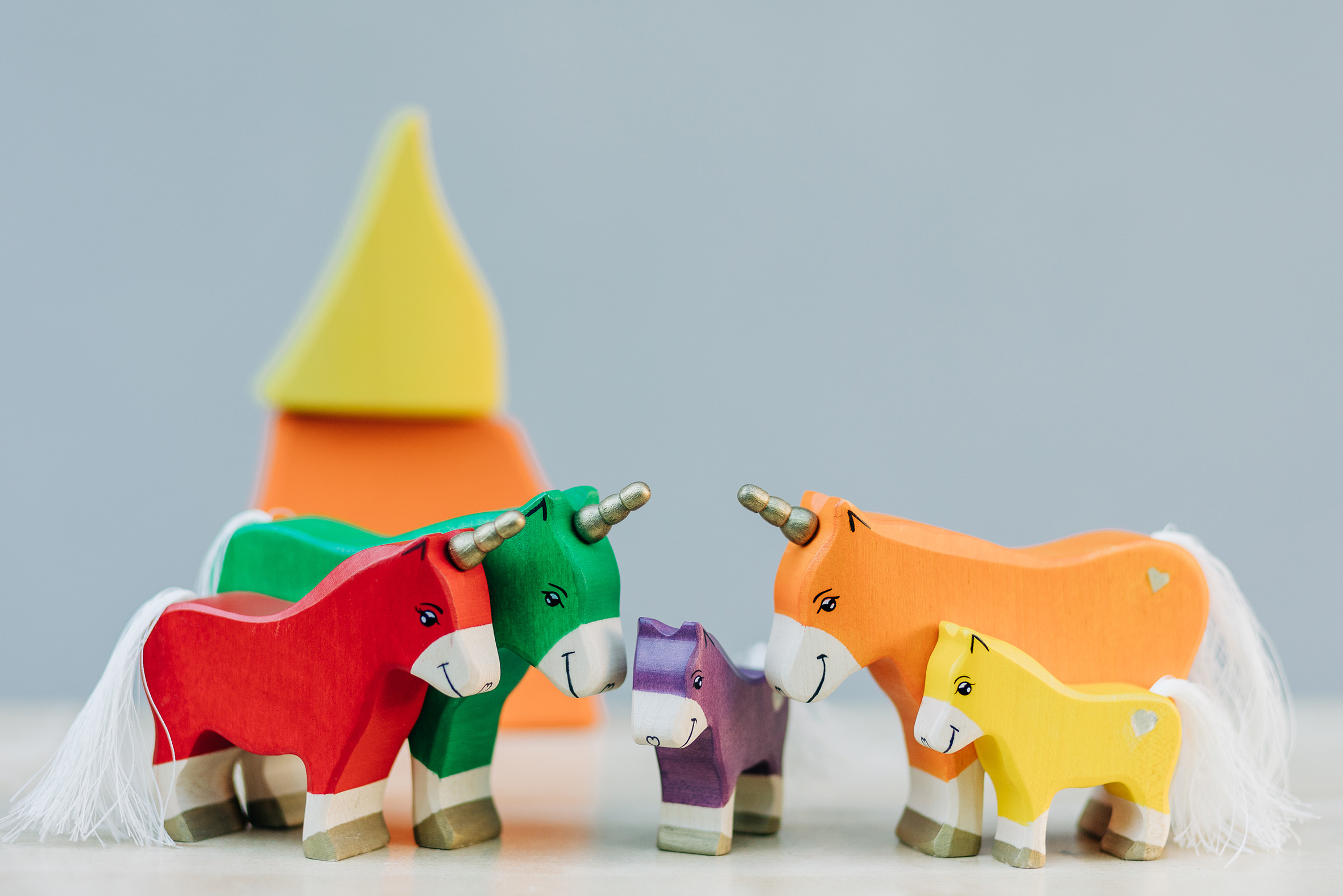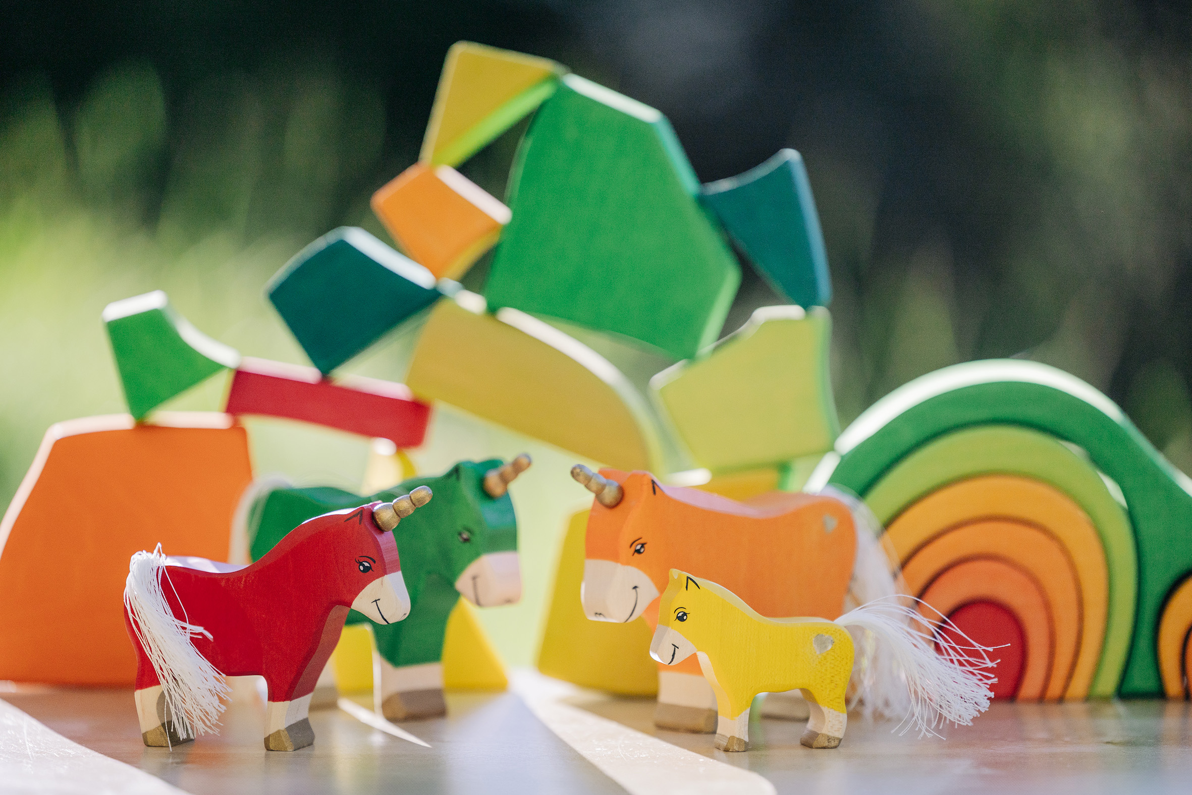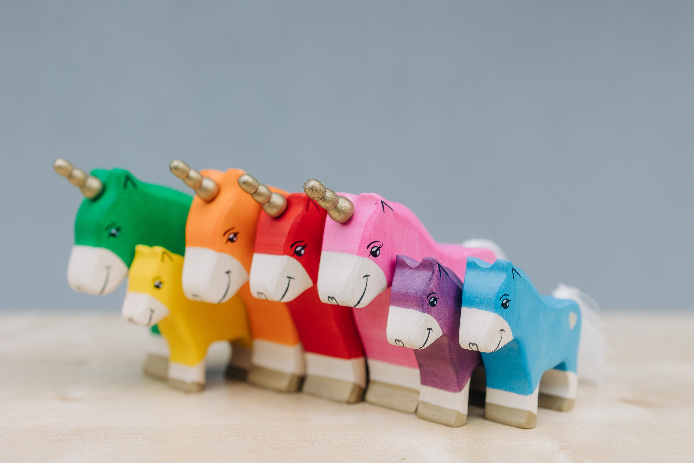 Willkommen in einer Welt voller Farben, Magie und unendlicher Fantasie! Unsere liebevoll handgefertigten Einhörner aus Holz laden Kinder dazu ein, in eine bunte Traumwelt einzutauchen, funkelnde Edelsteine und geheimnisvolle Abenteuer auf sie warten. Das stolze blaue Einhorn bewacht den Regenbogenpalast, während das goldene Einhorn neugierig durch die farbenfrohe Landschaft galoppiert. Und das zarte rosafarbene Einhorn bringt mit seiner Sanftheit eine Prise Zauber und Freundlichkeit in jede Geschichte. Begleitet werden die Fabelwesen von leuchtenden Holzbausteinen, die wie funkelnde Regenbogenkristalle wirken. Ob Türme, Regenbogenbrücken oder magische Höhlen – die bunten Elemente lassen sich immer wieder neu kombinieren und eröffnen unendliche Spielmöglichkeiten. Lass die Magie einziehen – entdecke jetzt unsere zauberhafte Einhorn-Welt!