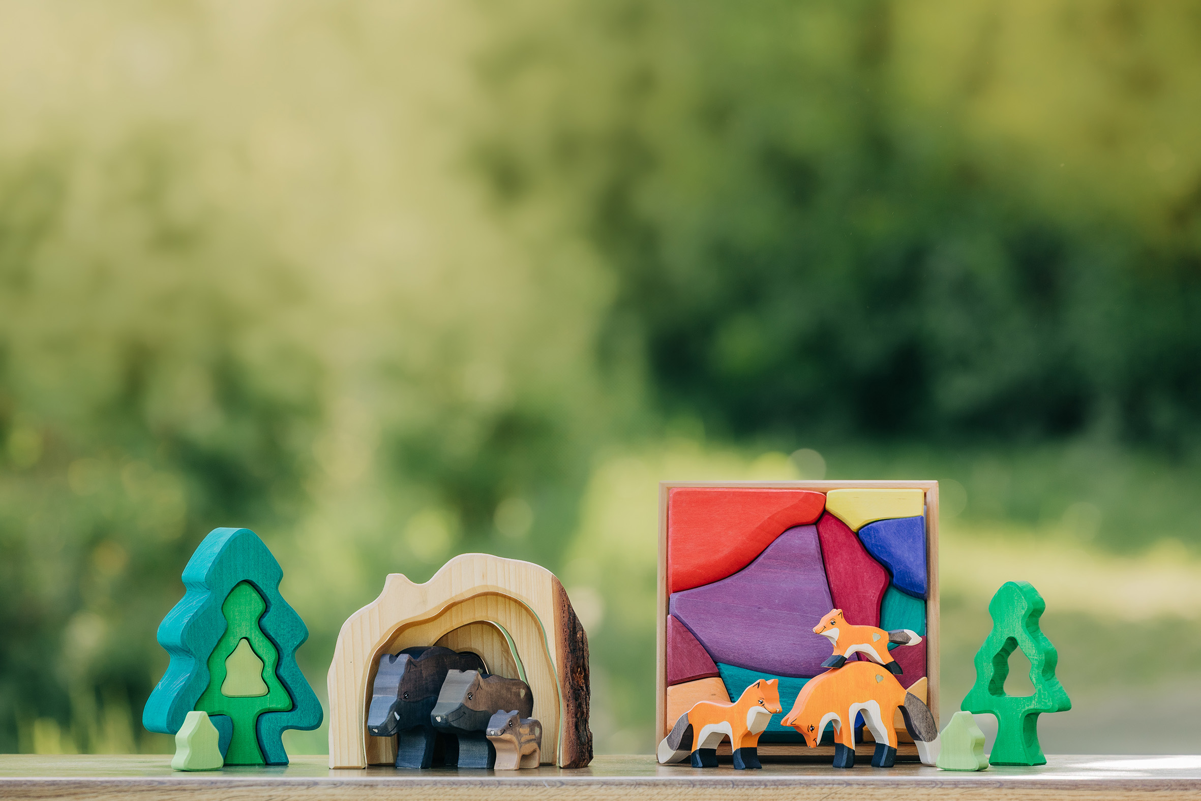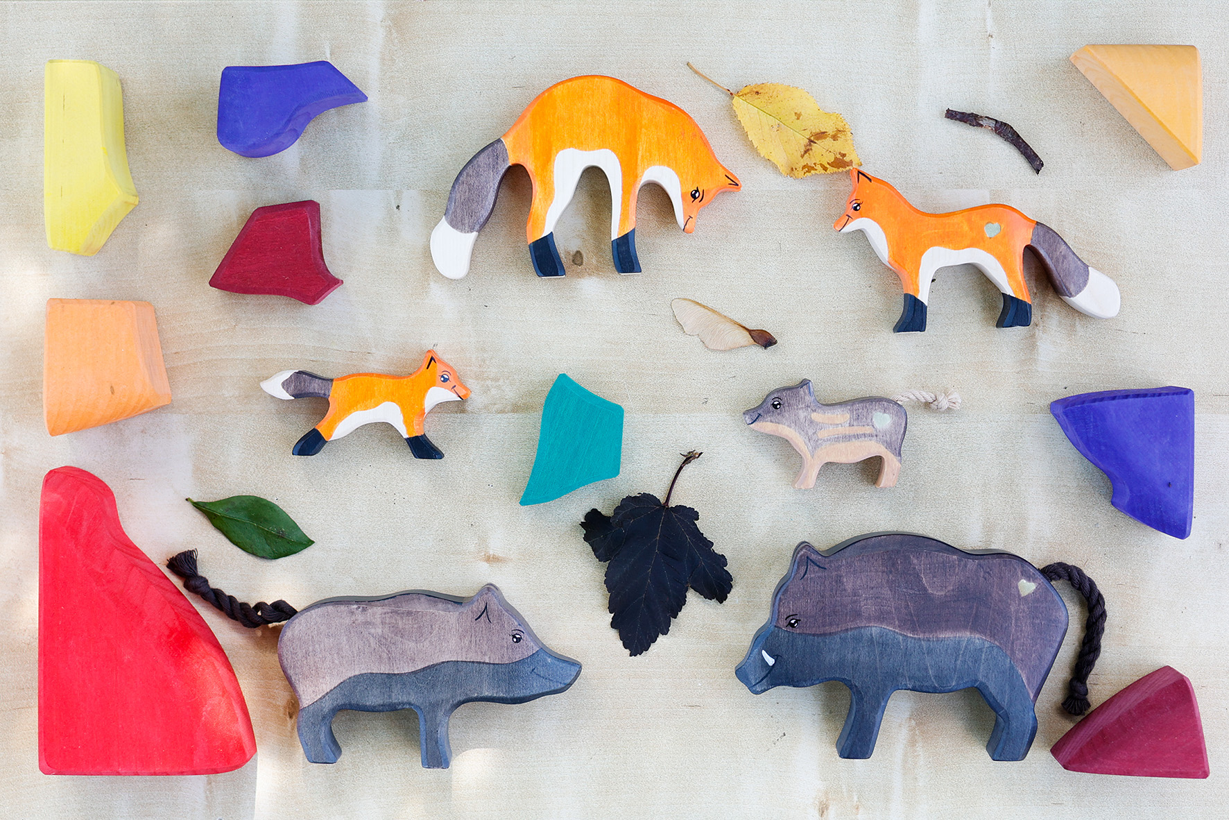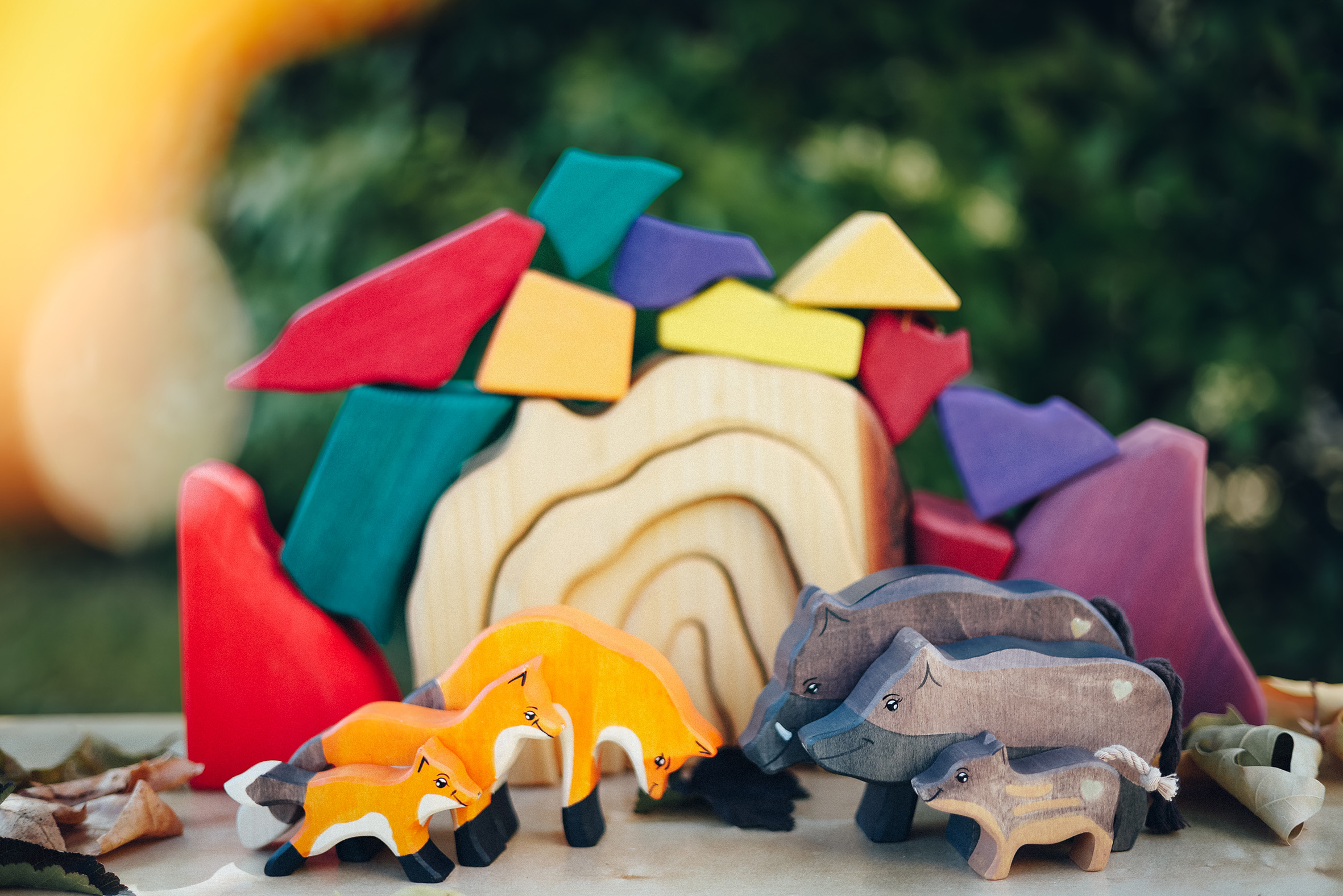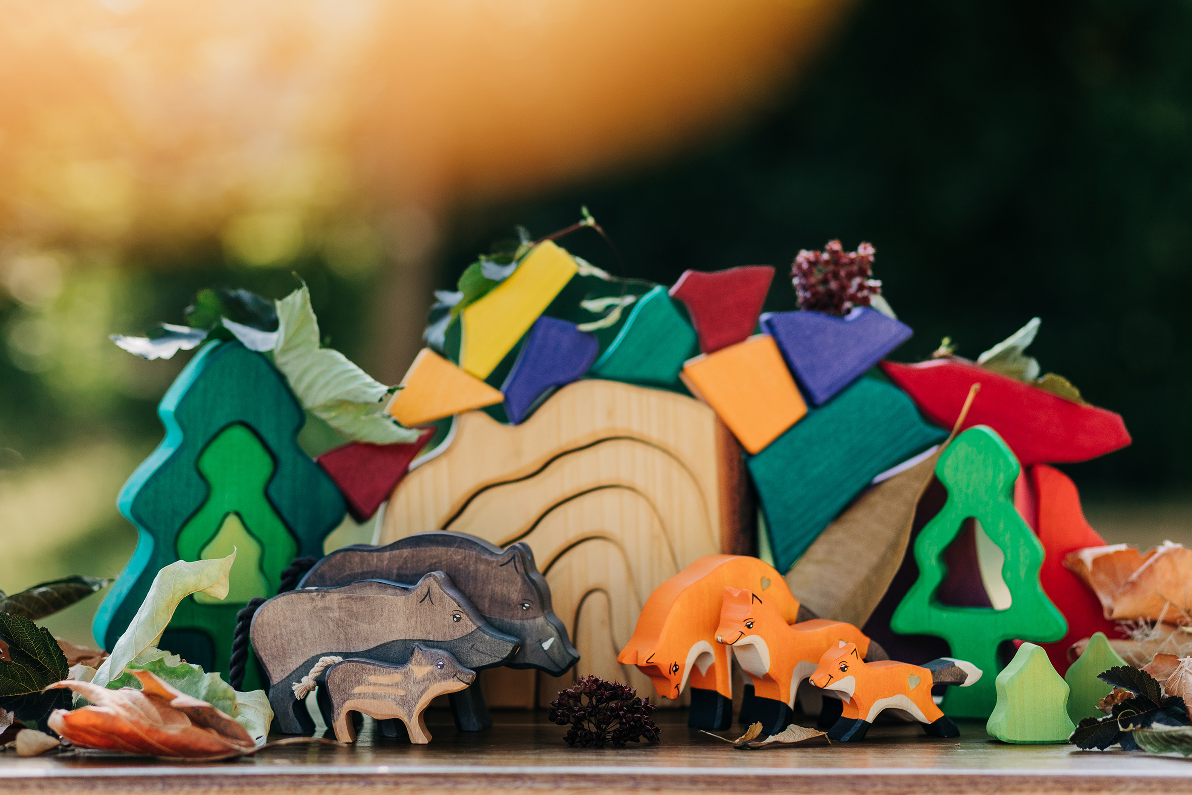 Zwischen goldenen Blättern und raschelndem Moos streifen die leuchtend orangefarbenen Füchse durch den Wald, immer auf der Suche nach einem neuen Abenteuer. In der Ferne grunzt die Wildschwein-Familie – stark, mutig und doch so sanft, wie nur eine Familie sein kann. Gemeinsam erkunden sie die bunte Landschaft aus handgefertigten Holzbausteinen, die sich mal als geheimnisvolle Höhle, mal als herbstliche Waldlichtung zeigen. Jedes einzelne Element – von der sanft geschwungenen Form bis zur intensiven Farbnuance – wird mit viel Liebe aus nachhaltigem Holz gefertigt und mit kindersicheren Farben bemalt. So entsteht nicht nur ein langlebiges Spielzeug, sondern ein Stück Natur, das Generationen überdauert.
