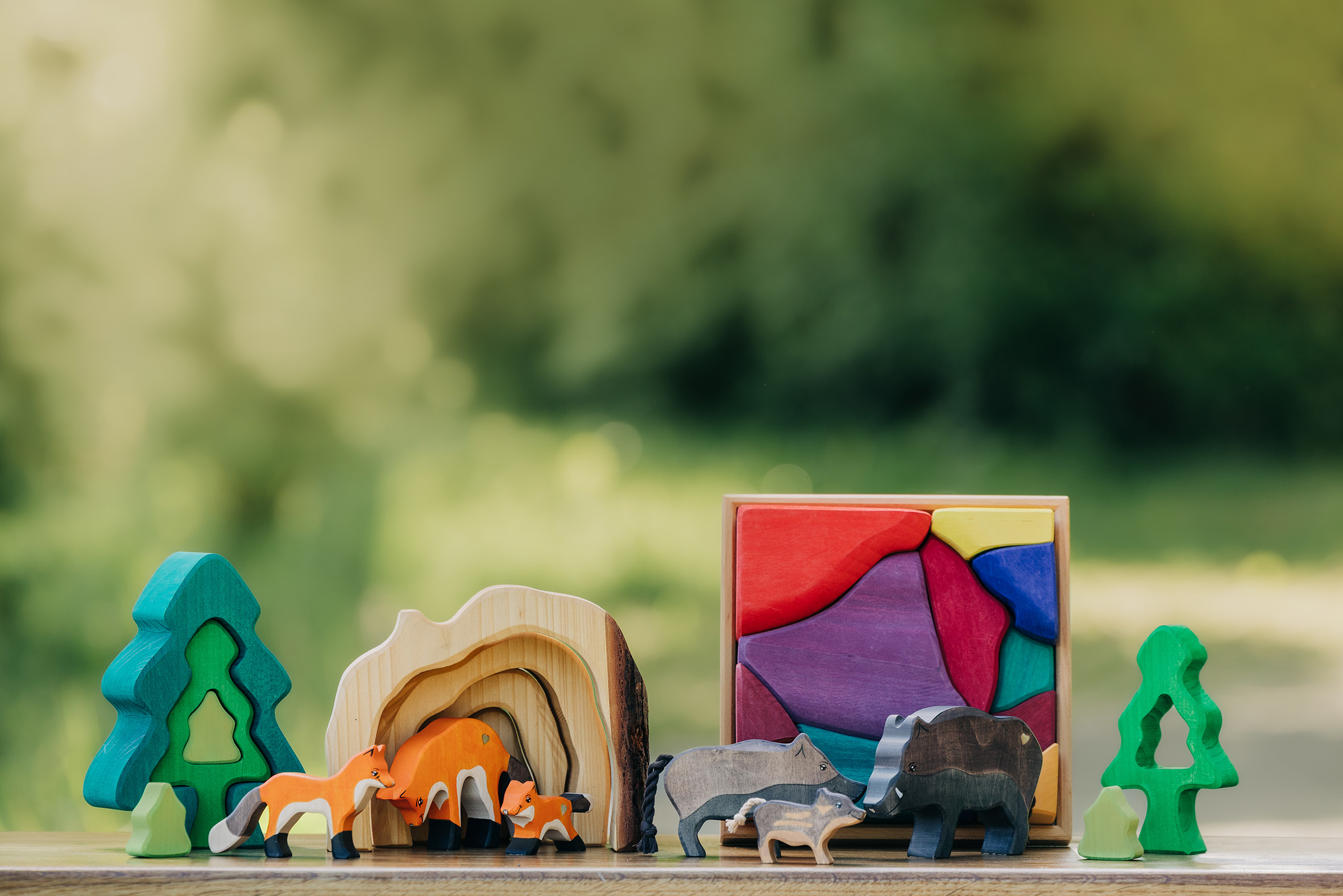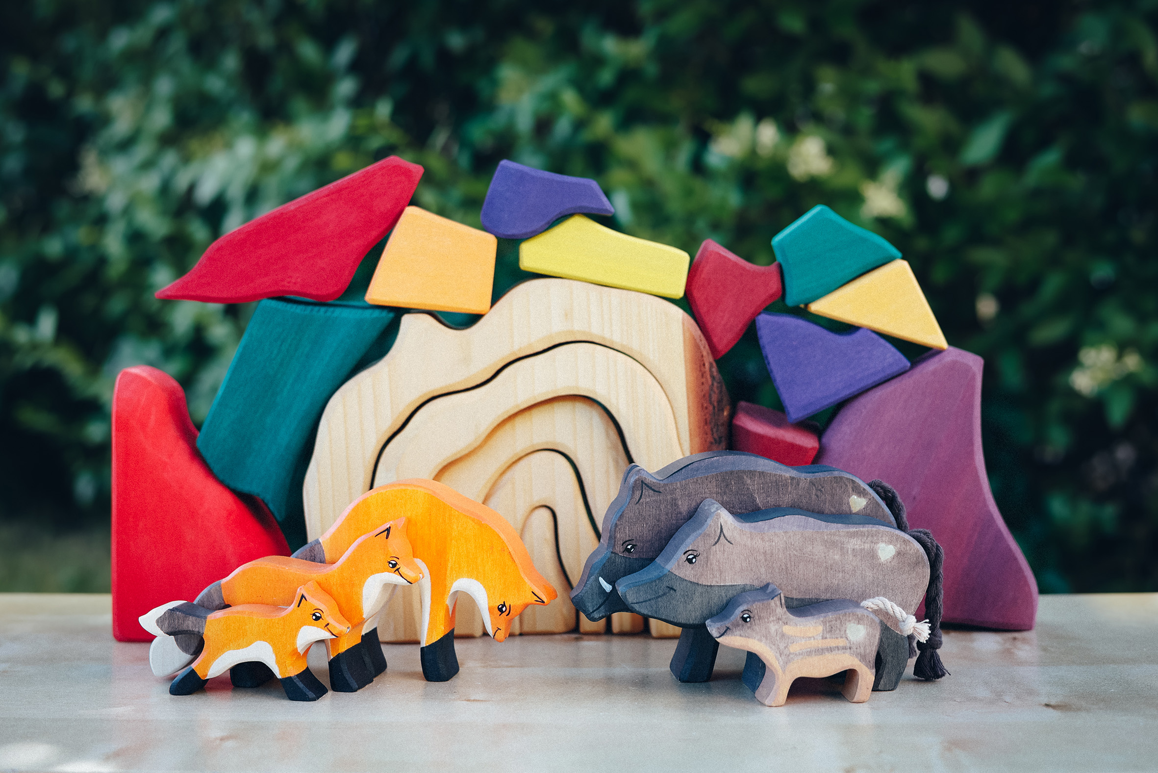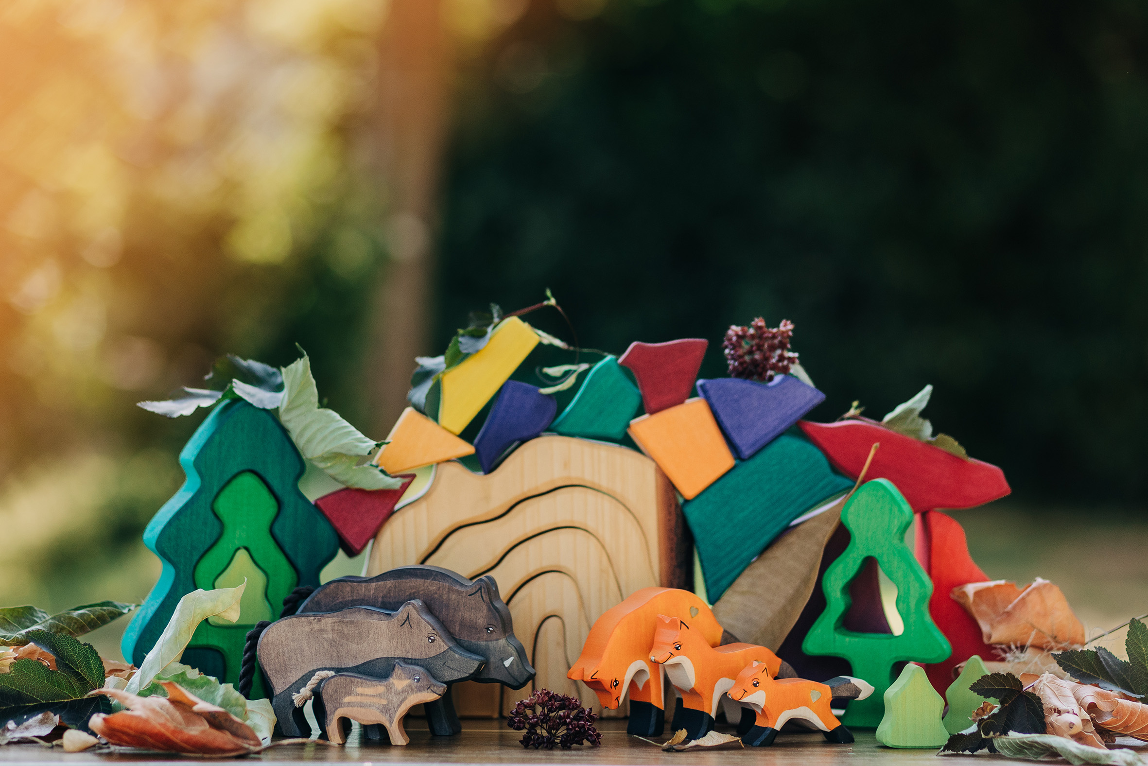 Zwischen goldenen Blättern und raschelndem Moos streifen die leuchtend orangefarbenen Füchse durch den Wald, immer auf der Suche nach einem neuen Abenteuer. In der Ferne grunzt die Wildschwein-Familie – stark, mutig und doch so sanft, wie nur eine Familie sein kann. Gemeinsam erkunden sie die bunte Landschaft aus handgefertigten Holzbausteinen, die sich mal als geheimnisvolle Höhle, mal als herbstliche Waldlichtung zeigen. Jedes einzelne Element – von der sanft geschwungenen Form bis zur intensiven Farbnuance – wird mit viel Liebe aus nachhaltigem Holz gefertigt und mit kindersicheren Farben bemalt. So entsteht nicht nur ein langlebiges Spielzeug, sondern ein Stück Natur, das Generationen überdauert.