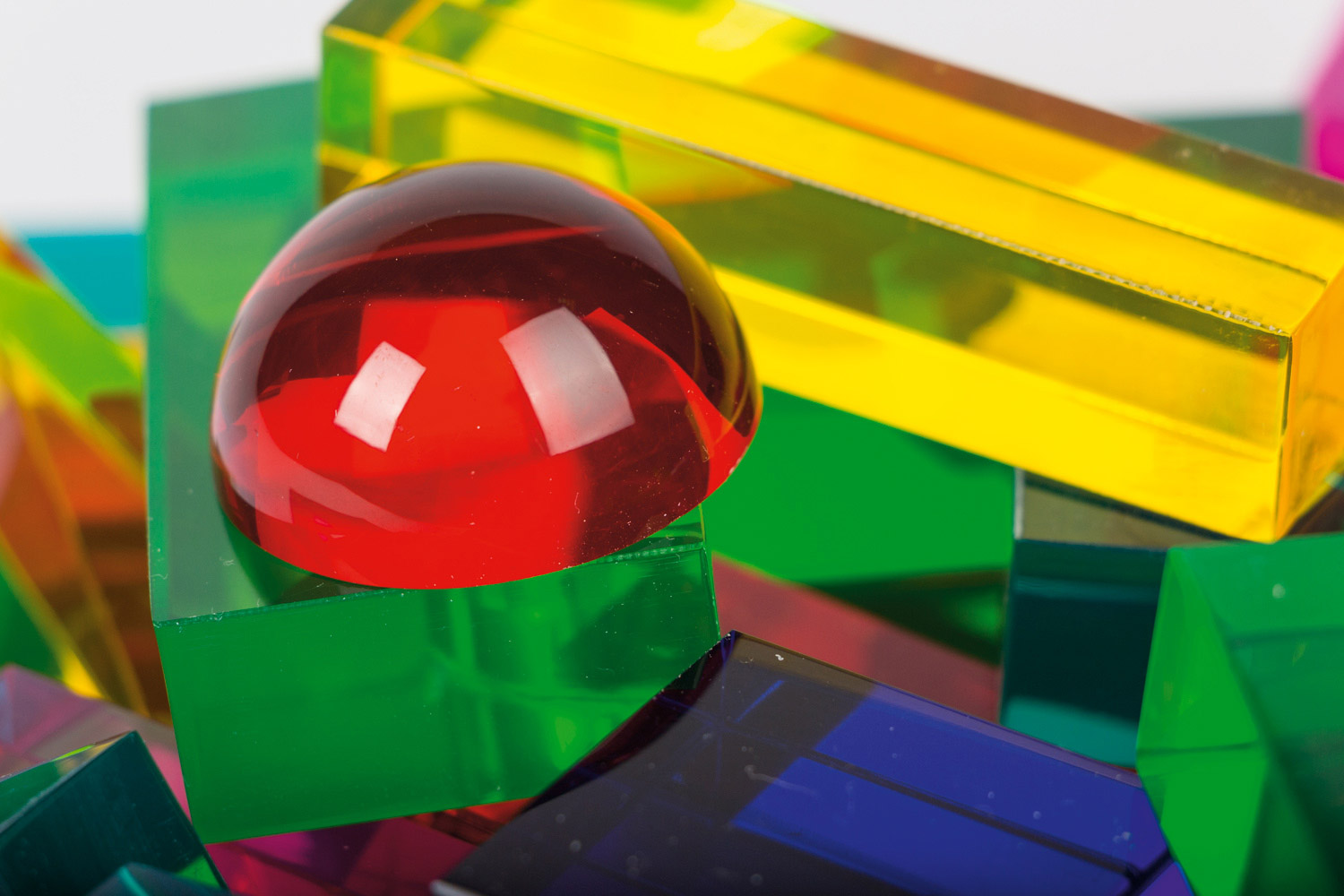 je 80 Steine (Säulensteine, Brückenbogen, Halbkugeln, diagonale geteilte Quader, halbe Quader, Quader 6,66 x 3,33 x 1,66 cm), 14 glasklare Platten, 1 Holzbaukasten in Buche, satinierter Boden (20,6 x 20,6 x 7 cm), 1 Acrylglasdeckel transparent