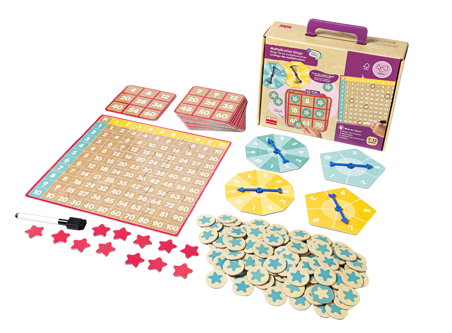 4 Roulette-Tafeln aus Karton, 1 wieder beschreibbare Maxi-Tafel aus Karton (27,6 x 27,6 cm), 12 Bingo-Tafeln aus Karton (11,6 x 11,6 cm), 120 runde Karten aus Karton (4 cm), 15 Sternmünzen aus Karton, 1 Filzstift