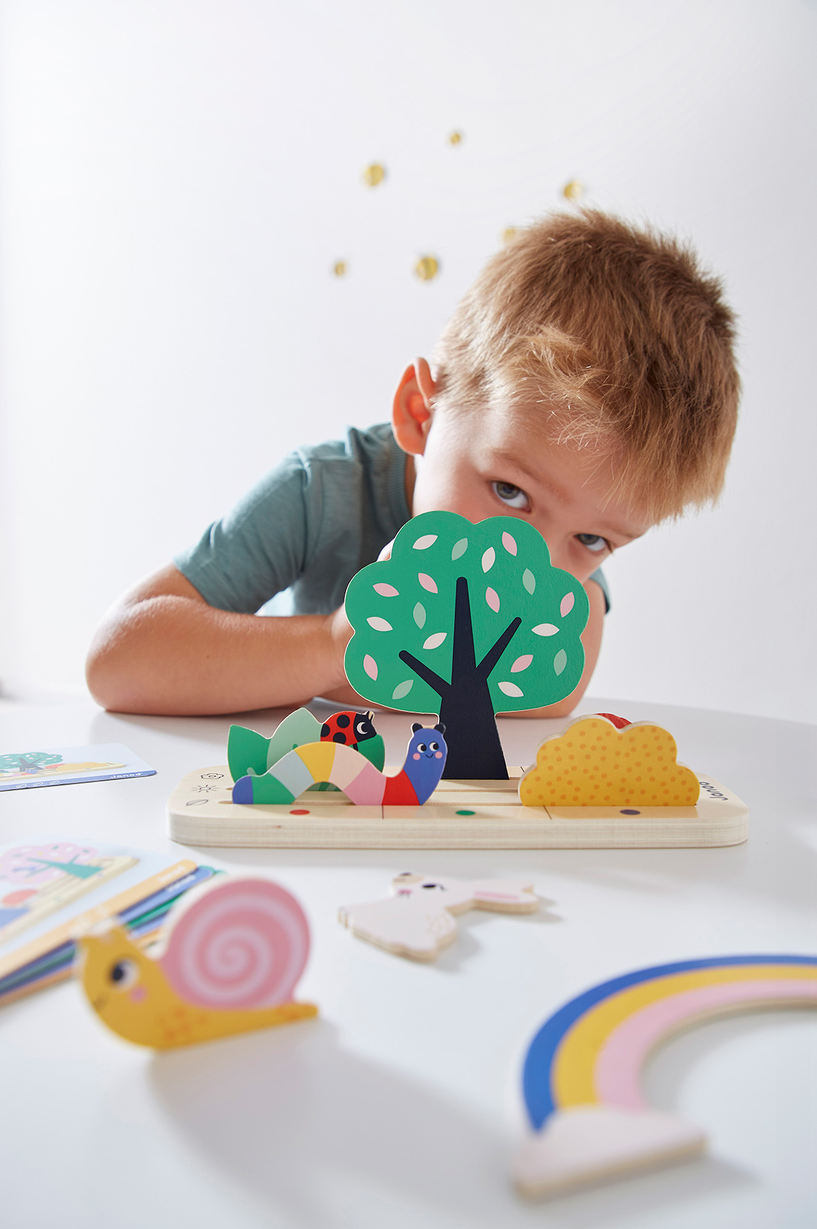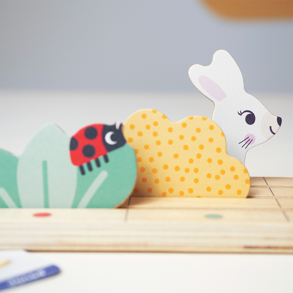 Dieses Lernspiel verbindet Spaß mit Lernen: Szenen mit Figuren nachlegen, Begriffe wie links/rechts lernen und die Beobachtungsgabe schärfen. Drei Schwierigkeitsstufen und Farbpunkte auf Karten und Unterlage erleichtern das Spielen – alleine oder gemeinsam mit Erwachsenen.