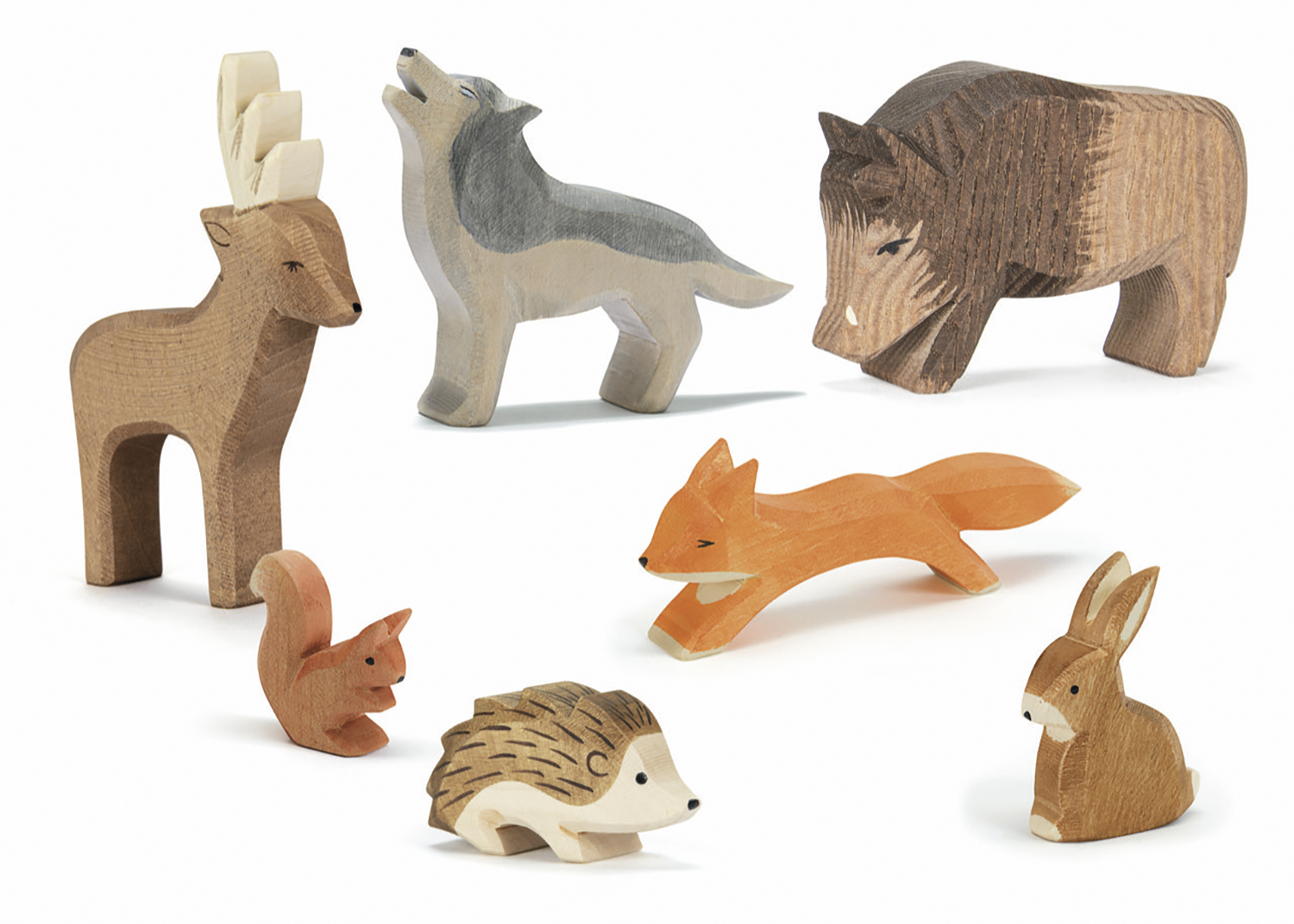7 Tiere, (1 Rehbock 12,5 cm, 1 Igel 4 cm, 1 Wolf, 1 Hase, 1 Wildschwein, 1 Fuchs, 1 Eichhörnchen)