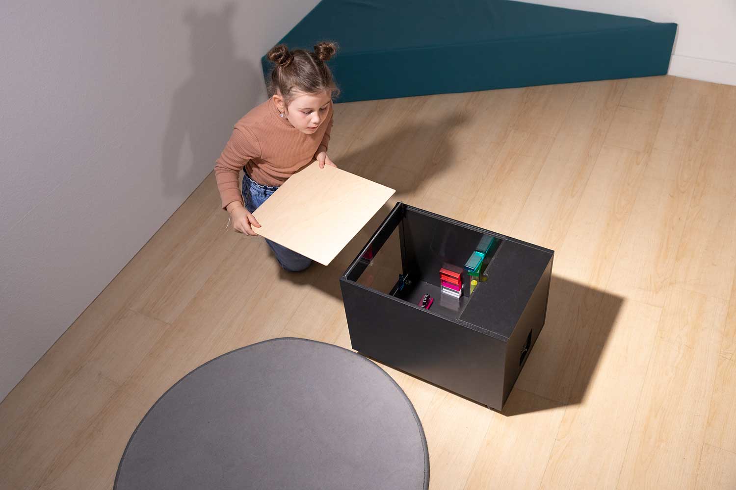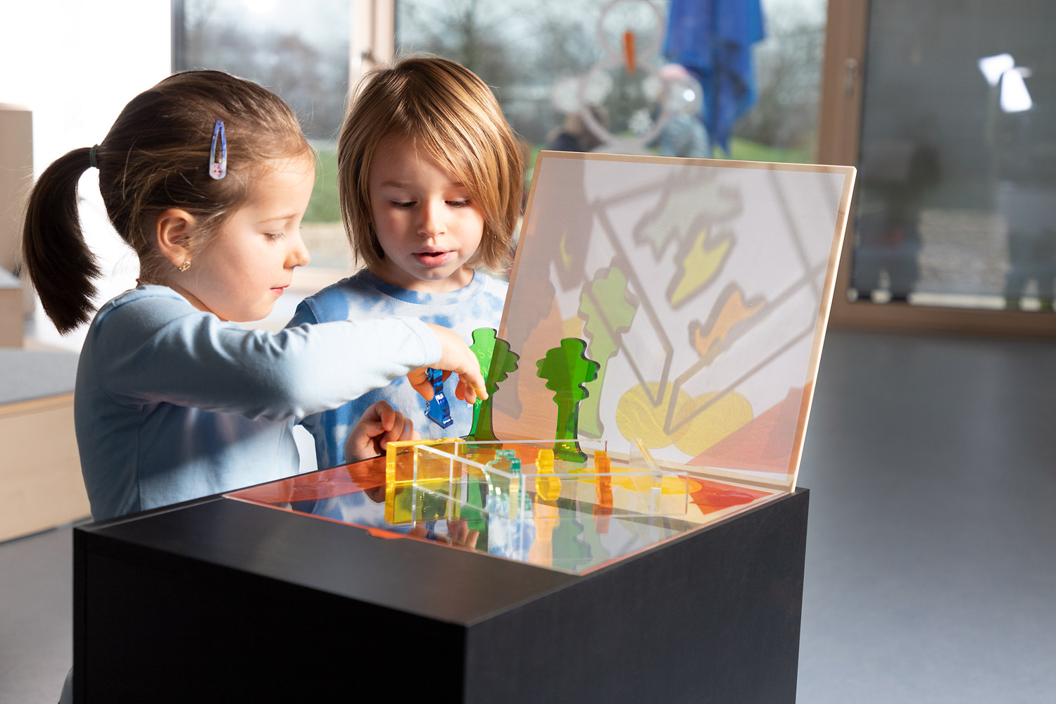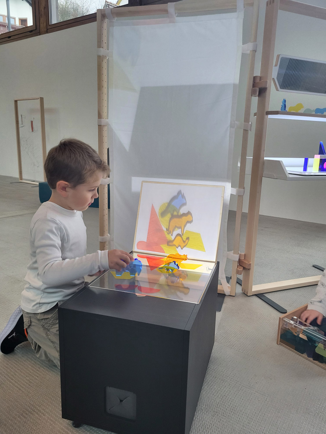 Mit Neugier und Forscherdrang entdecken Kinder das Spiel mit Licht. Dusyma hat speziell hierfür eine mobile Projektorbox mit 2 möglichen Projektionsflächen entwickelt. Es werden physikalische Phänomene sichtbar: die Lichtquelle ist beweglich und der Weg des Lichts nachvollziehbar. Mit einer handelsüblichen Taschenlampe (nicht enthalten) ist die Box mobil im Raum, ohne Stromanschluss, einsetzbar. Durch frei kombinierte Materialien entstehen kreative Kunstwerke, die gleichzeitig Bilder auf der Projektionsfläche sind. Da immer häufiger Overheadprojektoren durch Beamer ersetzt werden, ermöglicht diese Box Kindern weiterhin das Experimentieren mit magisch, beeindruckenden Licht- und Schattenszenen.
