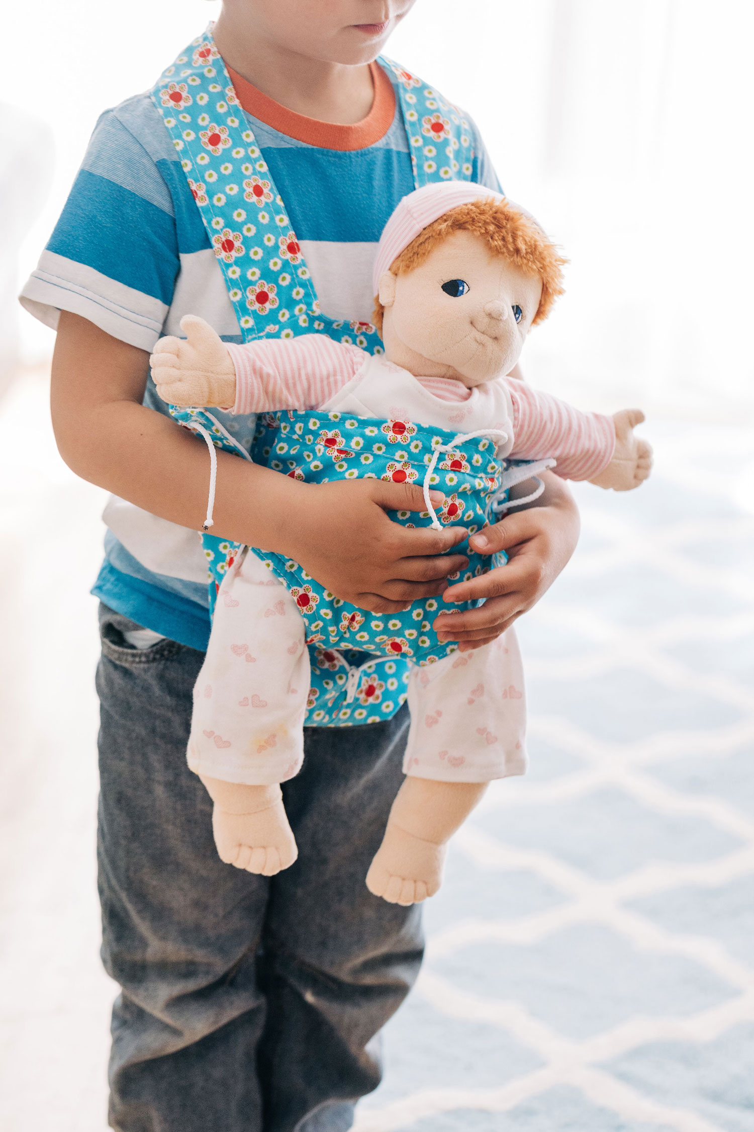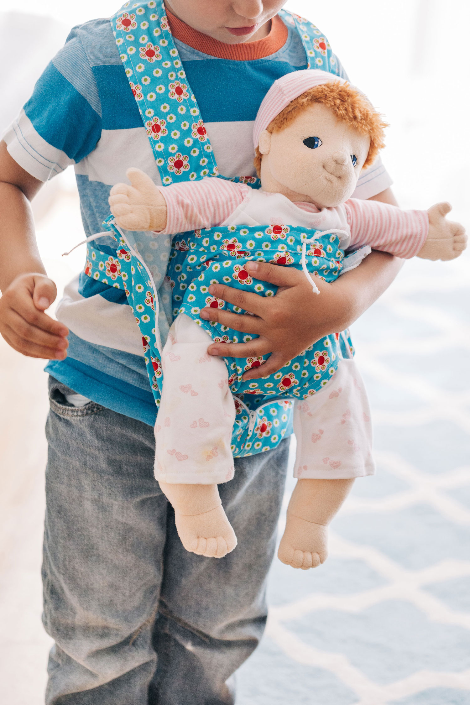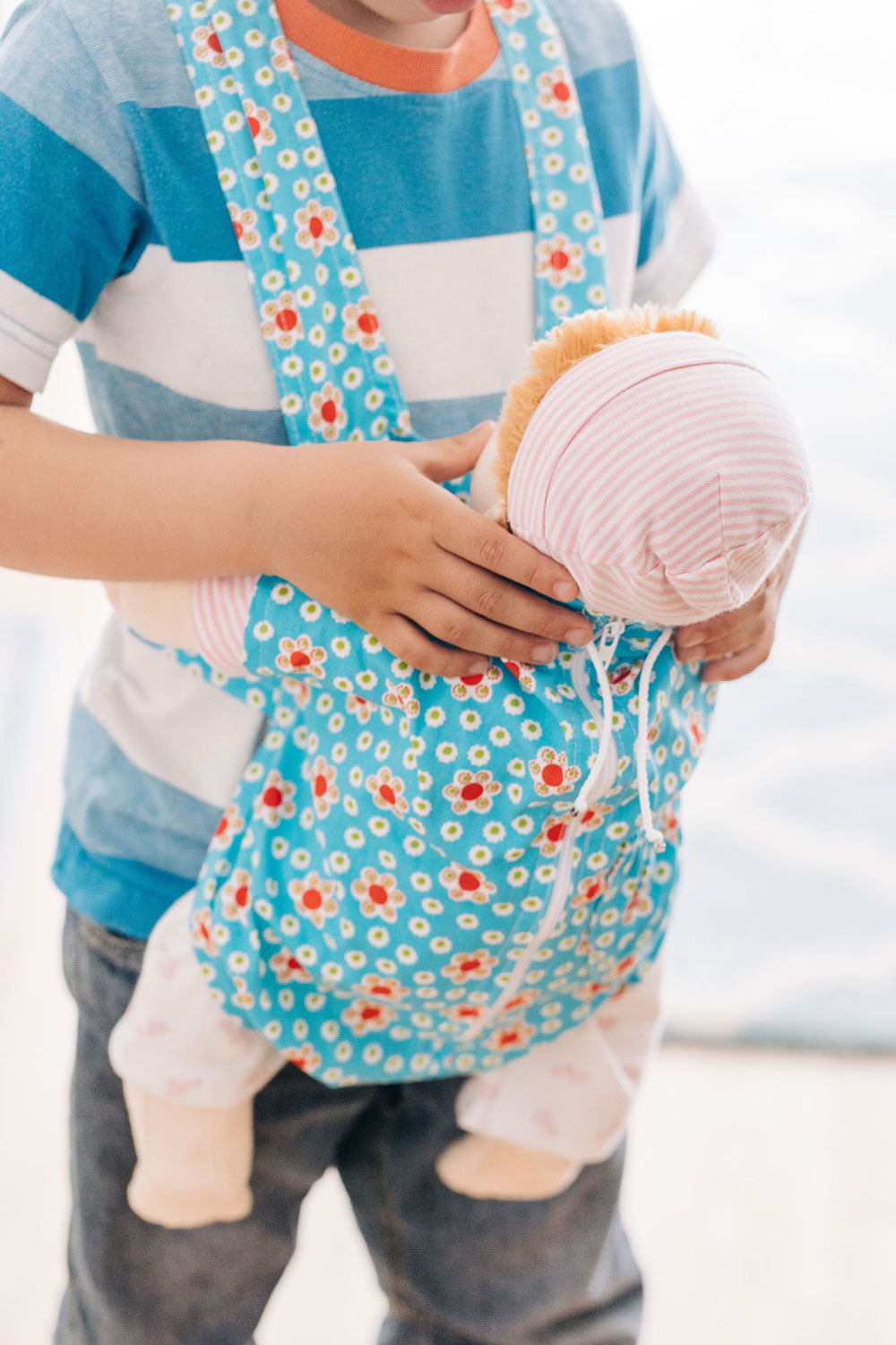 Ach, es ist doch einfach herrlich kuschelig, wenn das Puppenkind oder das Lieblingskuscheltier unterwegs schön eingehüllt mit dabei sein darf. Die praktische Bauchtrage ist sehr einfach anzuziehen. Der Kopf und die Arme gehen einfach durch die Gurte hindurch wie beim Anlegen einer Schürze. Unsere hübsche Kinder-Puppentrage hat ein kleineres Innenfach und ein darum herum zu schließendes Außenfach für größere Puppen oder Kuscheltiere bis ca. 50 cm. Die Innentrage wird mit einem Band oben festgemacht, die Außentasche hat zusätzlich einen Reißverschluss. So gemütlich eingepackt und dicht an das Kind geschmiegt, sind die Lieblingspuppen und Kuscheltiere friedlich eingehüllt und geborgen. Und dann darf es gemeinsam losgehen, hinaus in die Welt… Insbesondere wenn ein kleines Geschwisterkind unterwegs ist, ist das nachahmende Spiel mit Puppen wohltuend und sinnstiftend für die größeren Kinder. Spielerisch und sanft kann so die liebevolle Pflege und Versorgung der kleineren, schutzbedürftigen Kindlein nachgeahmt und empfunden werden. Eine schöne, kuschelige Puppentrage ist für das Spiel mit Puppen ein bedachtes und liebevolles Geschenk. Bitte beachten Sie, dass das Stoffmuster variieren kann. Die Puppentrage hat zwei Aufbewahrungs-Möglichkeiten: Für das Babypüppchen im inneren Tragesack und die große Außentrage mit Reißverschluss für weitere Begleiter bis 50 cm.