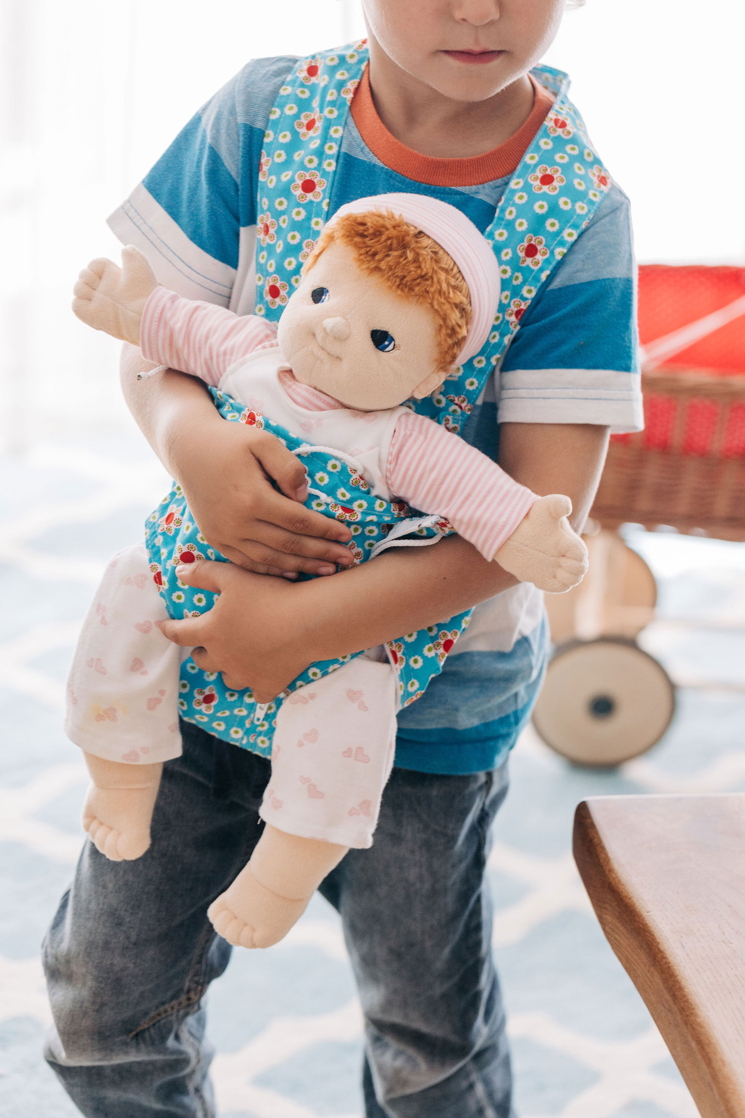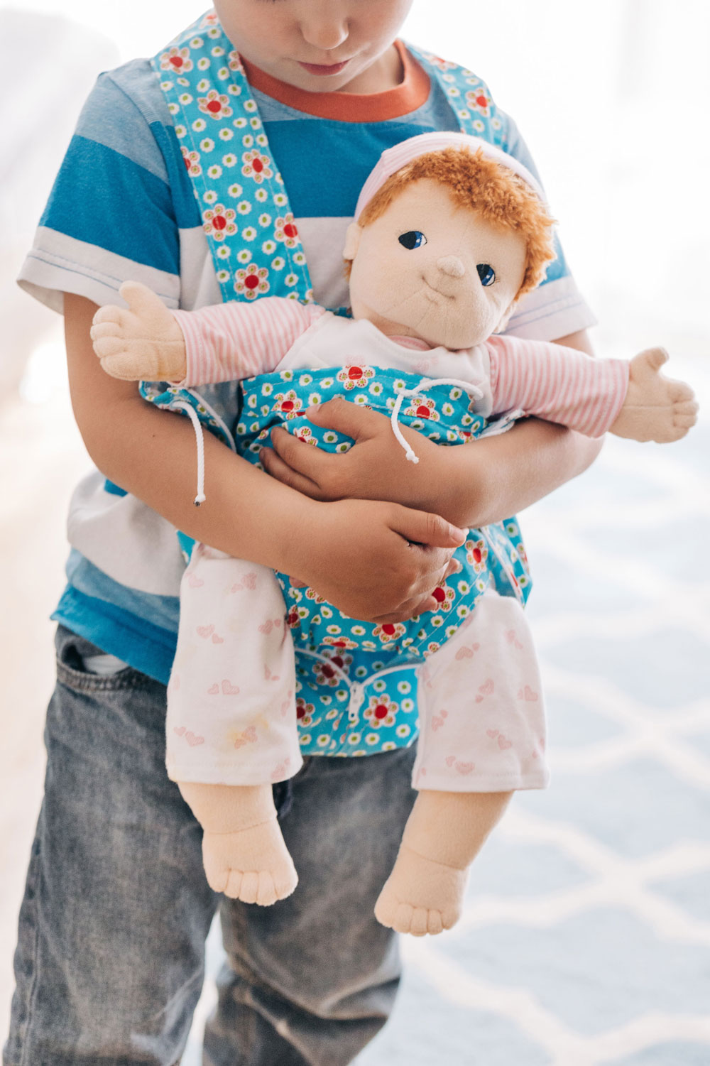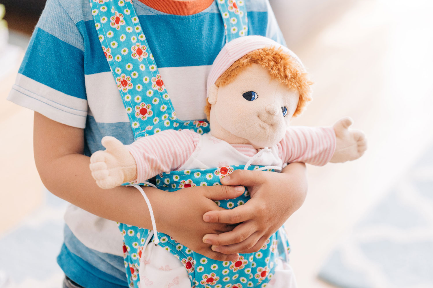 Ach, es ist doch einfach herrlich kuschelig, wenn das Puppenkind oder das Lieblingskuscheltier unterwegs schön eingehüllt mit dabei sein darf. Die praktische Bauchtrage ist sehr einfach anzuziehen. Der Kopf und die Arme gehen einfach durch die Gurte hindurch wie beim Anlegen einer Schürze. Unsere hübsche Kinder-Puppentrage hat ein kleineres Innenfach und ein darum herum zu schließendes Außenfach für größere Puppen oder Kuscheltiere bis ca. 50 cm. Die Innentrage wird mit einem Band oben festgemacht, die Außentasche hat zusätzlich einen Reißverschluss. So gemütlich eingepackt und dicht an das Kind geschmiegt, sind die Lieblingspuppen und Kuscheltiere friedlich eingehüllt und geborgen. Und dann darf es gemeinsam losgehen, hinaus in die Welt… Insbesondere wenn ein kleines Geschwisterkind unterwegs ist, ist das nachahmende Spiel mit Puppen wohltuend und sinnstiftend für die größeren Kinder. Spielerisch und sanft kann so die liebevolle Pflege und Versorgung der kleineren, schutzbedürftigen Kindlein nachgeahmt und empfunden werden. Eine schöne, kuschelige Puppentrage ist für das Spiel mit Puppen ein bedachtes und liebevolles Geschenk. Bitte beachten Sie, dass das Stoffmuster variieren kann. Die Puppentrage hat zwei Aufbewahrungs-Möglichkeiten: Für das Babypüppchen im inneren Tragesack und die große Außentrage mit Reißverschluss für weitere Begleiter bis 50 cm.