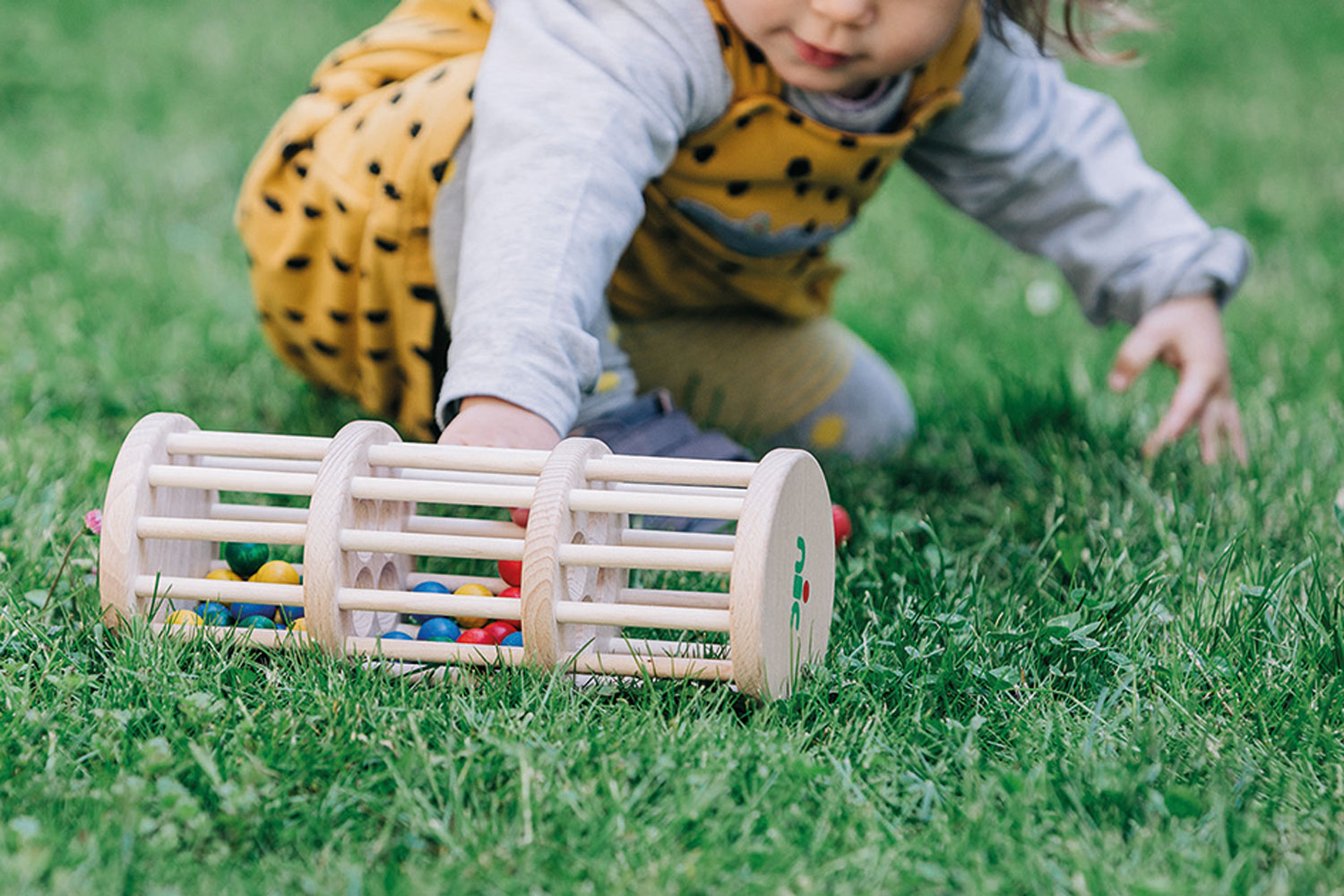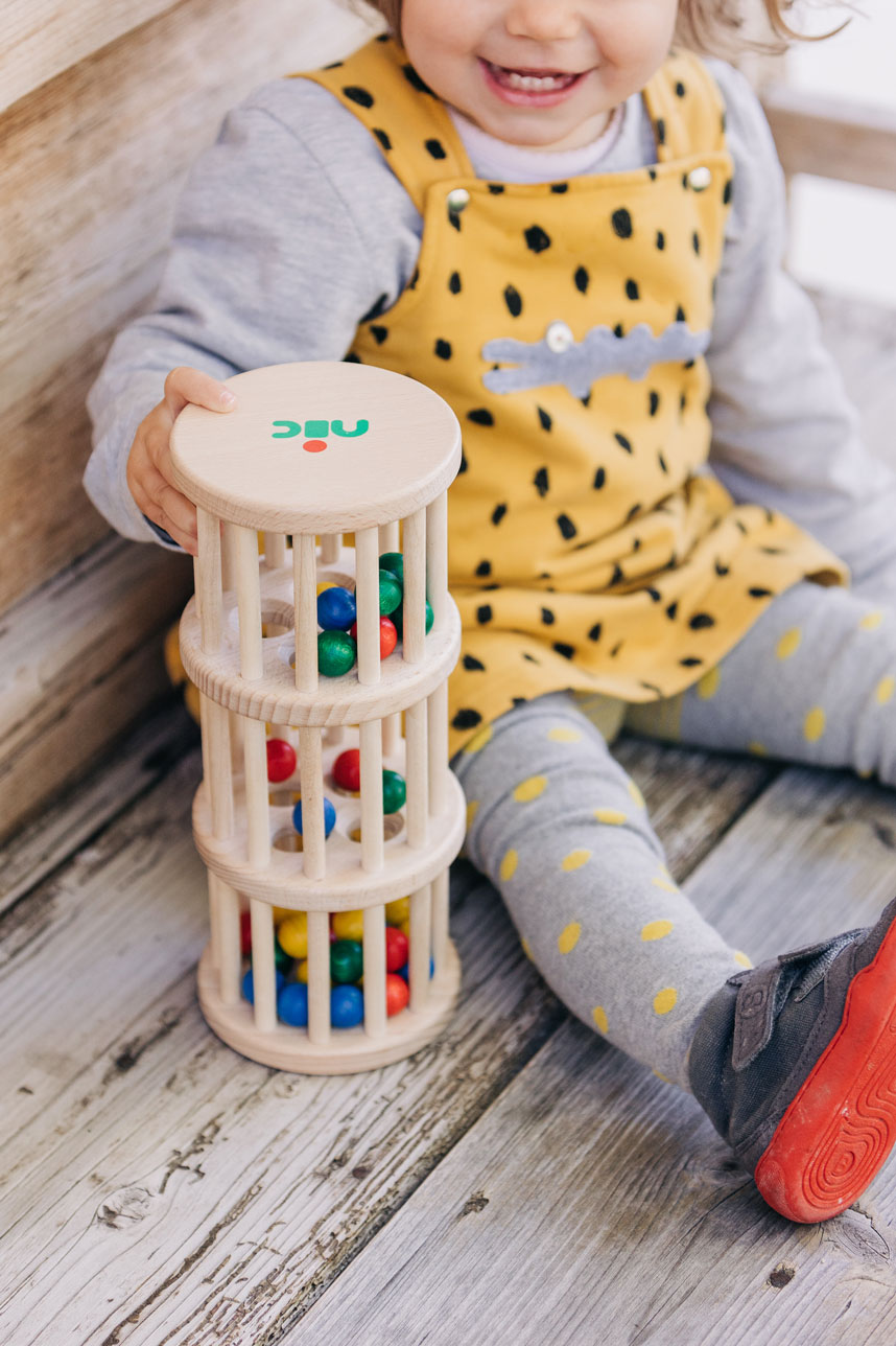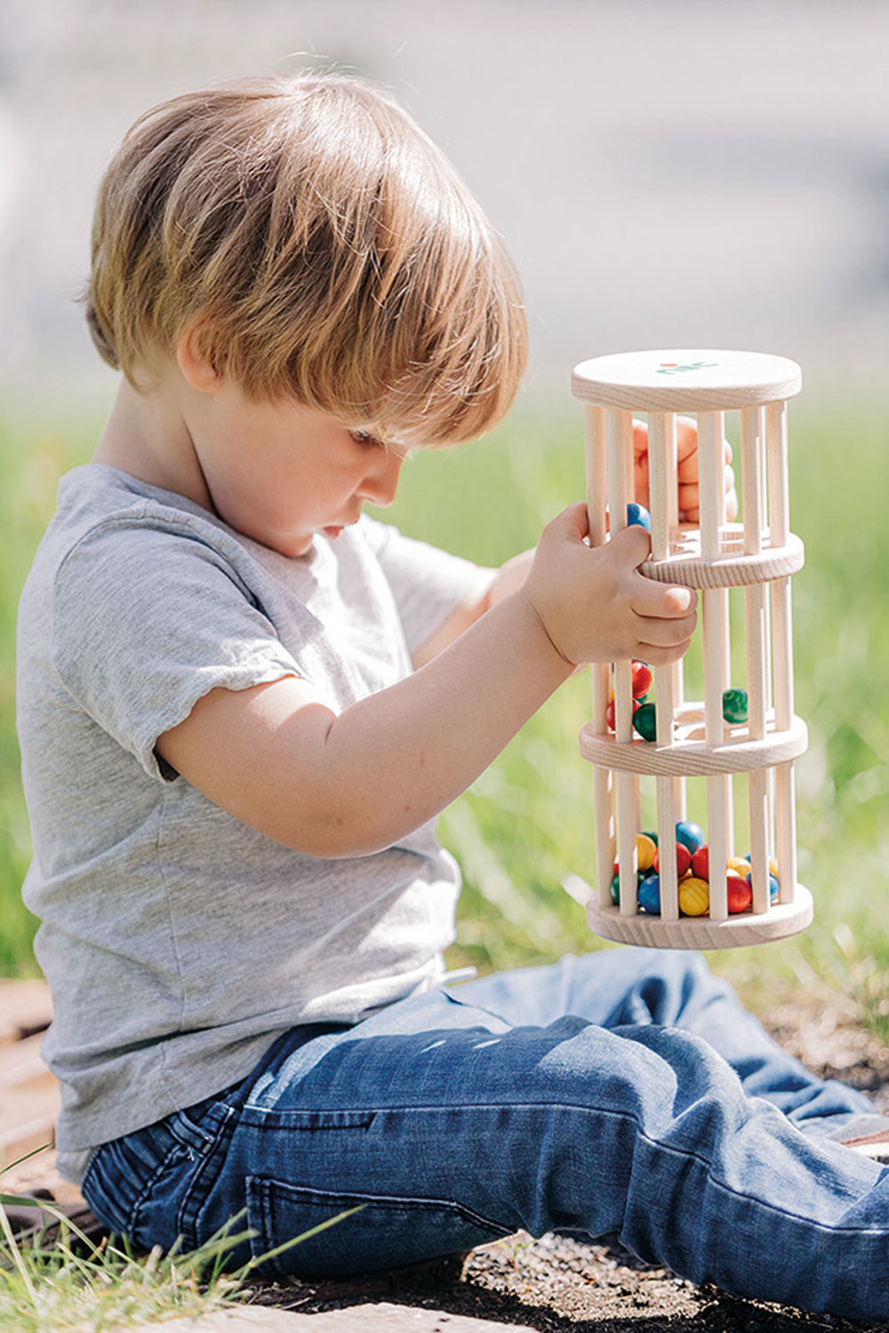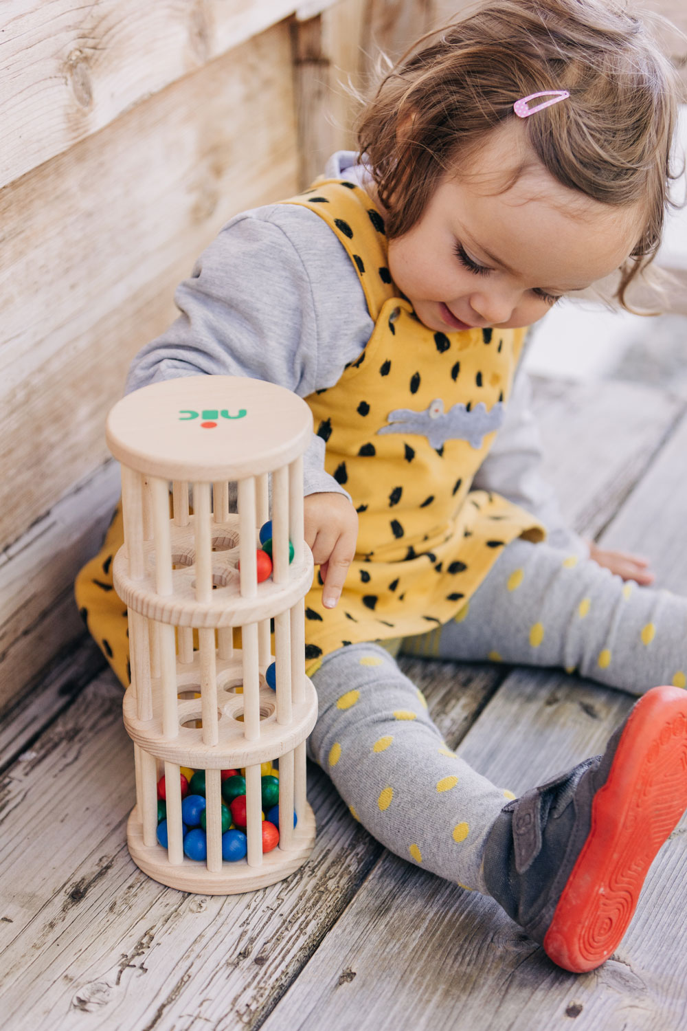 Aufgestellt fallen viele kleine Holzkugeln durch die Ebenen im Turm und machen dabei ein angenehmes Holz-Rassel-Geräusch. Auch wenn der Turm auf dem Boden gerollt wird, ist es ein Spaß, die bunten Kugeln zu sehen und zu hören. Optisch und akustisch ein faszinierendes Spielzeug.