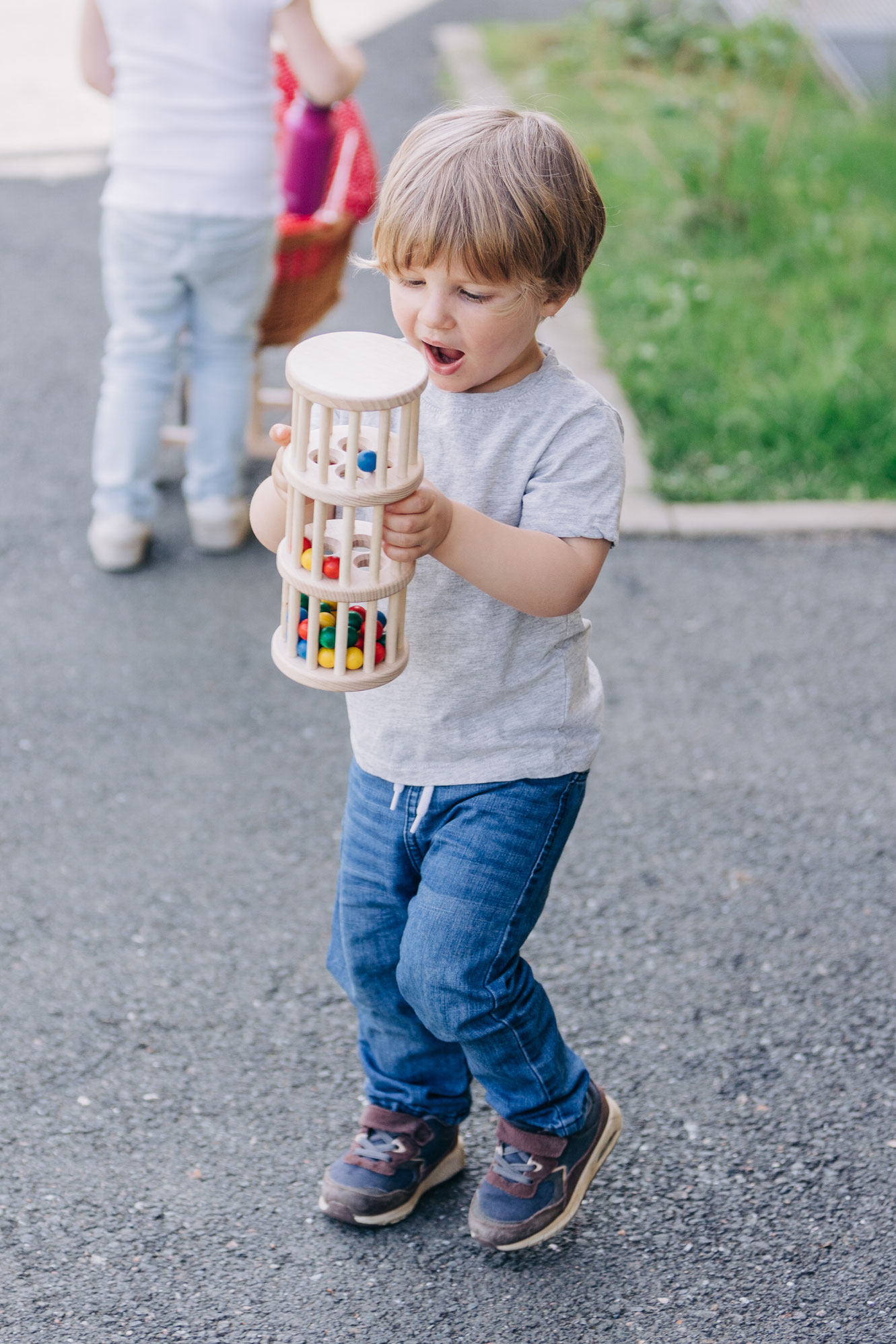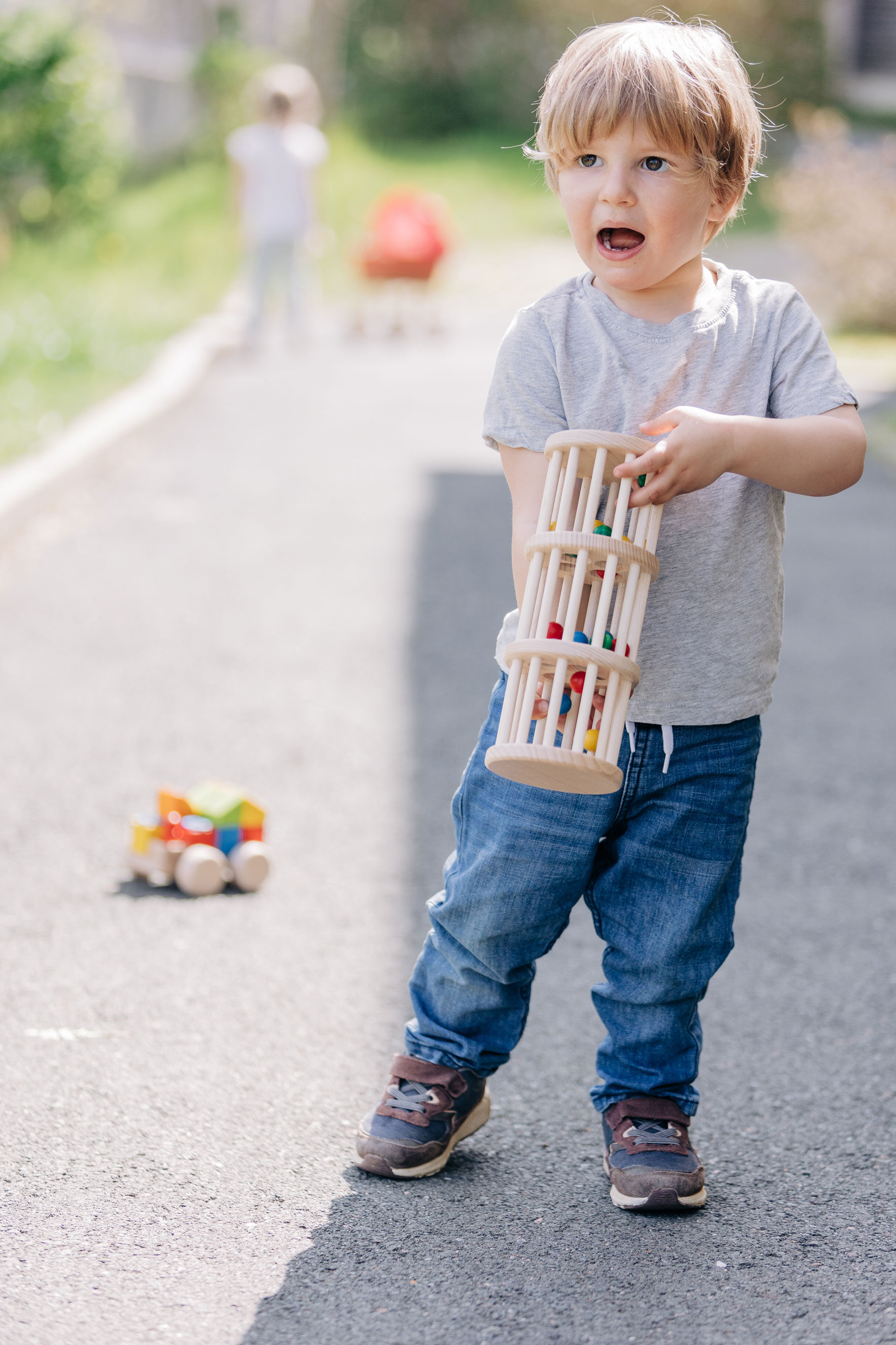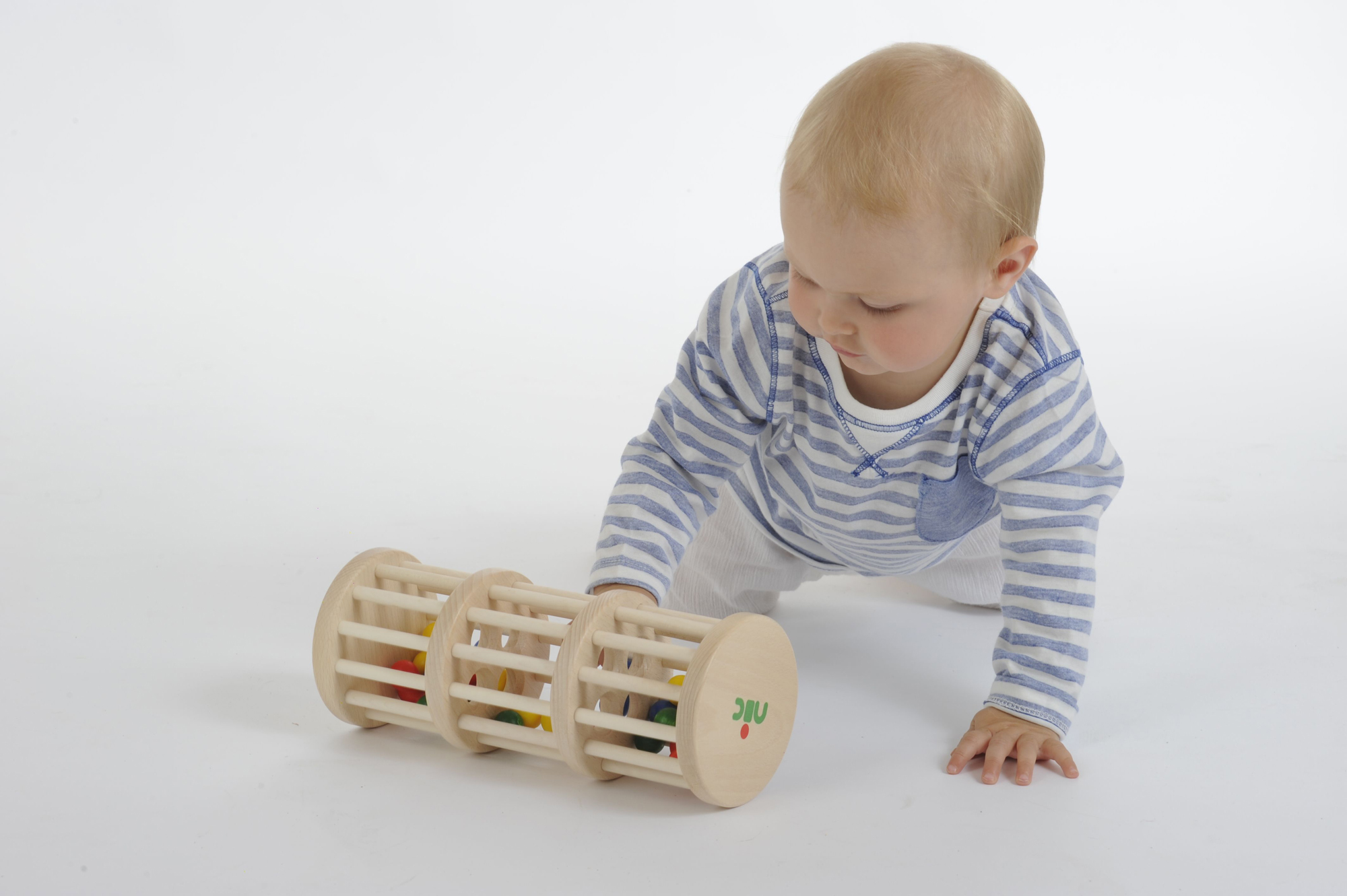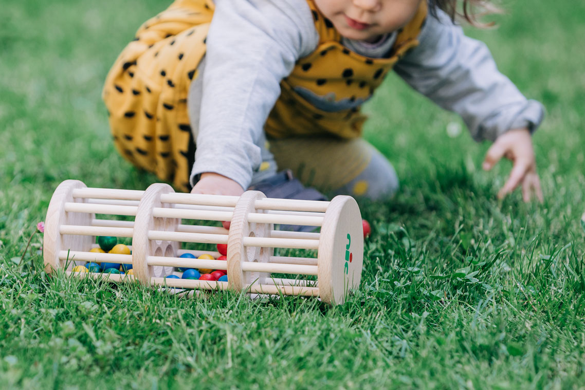 Aufgestellt fallen viele kleine Holzkugeln durch die Ebenen im Turm und machen dabei ein angenehmes Holz-Rassel-Geräusch. Auch wenn der Turm auf dem Boden gerollt wird, ist es ein Spaß, die bunten Kugeln zu sehen und zu hören. Optisch und akustisch ein faszinierendes Spielzeug.