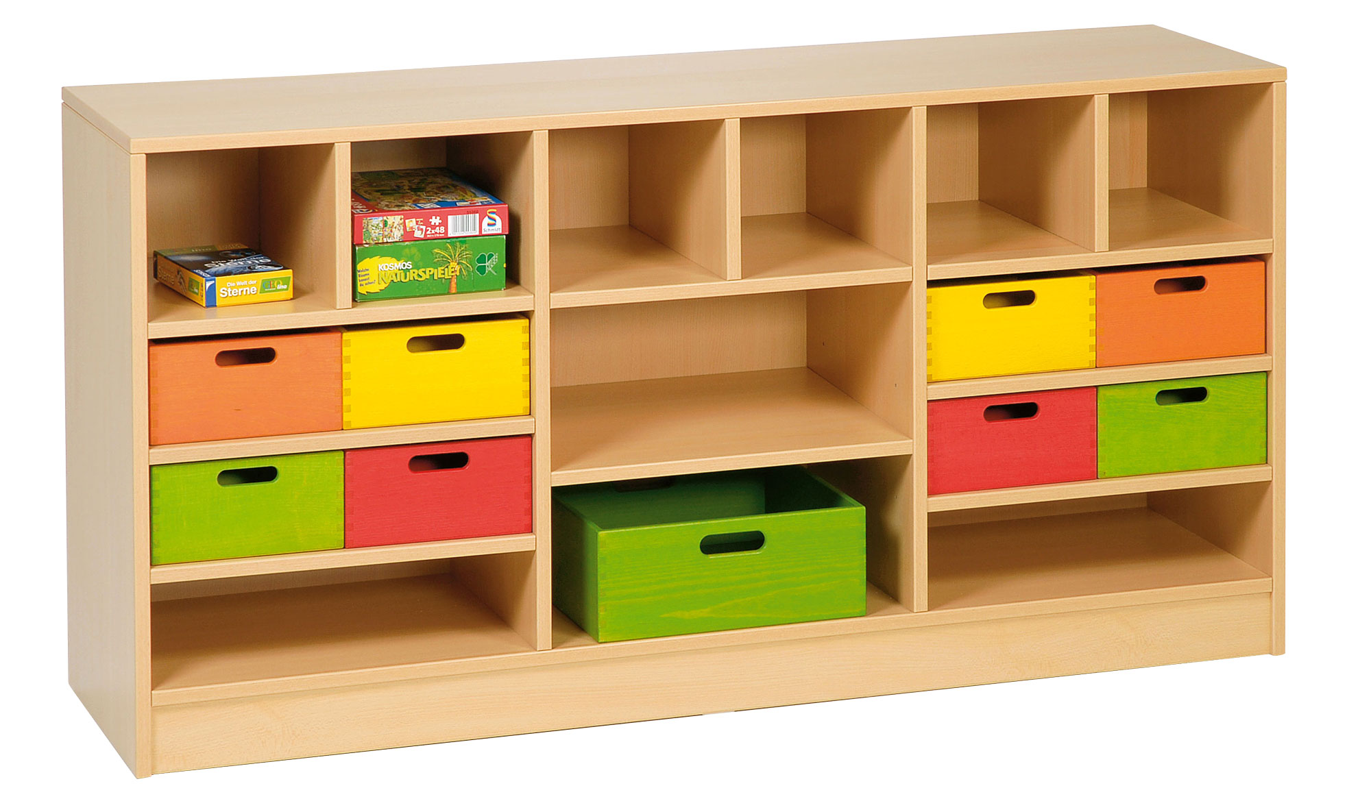 1 Raumteilregal, (Oben 6 kleine Fächer (22,6 cm breit, 20,3 cm hoch), darunter drei gleich breite Fächer (47,1 cm breit, 42,5 cm hoch) links und rechts mit zwei Fachböden, in der Mitte 1 Fachboden, alle Fächer sind 38 cm tief), passende Materialkästen (bitte separat bestellen): oben: 6 x 402 120 - 402 129, rechts und links: 402 100 - 402 109, je 2 pro Fach, mittig: 402 180 - 402 189, je 2 pro Fach
