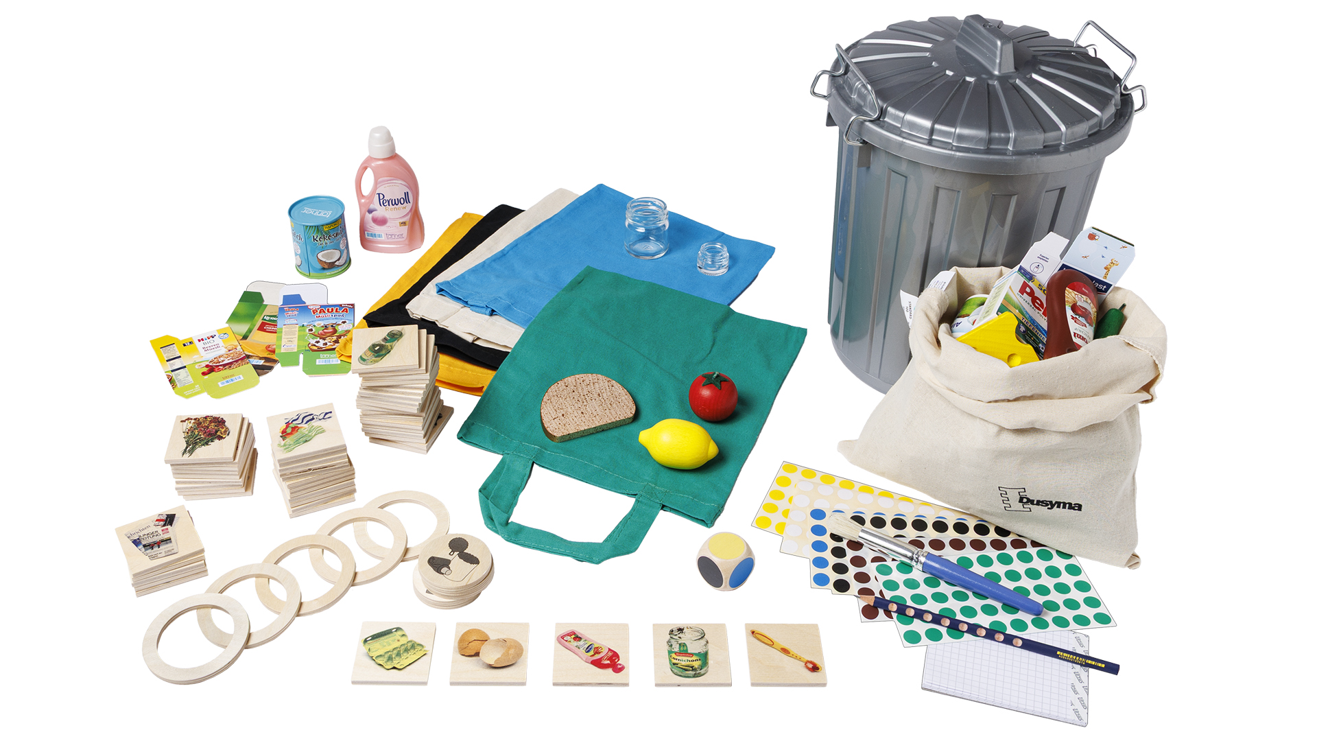 50 Holztäfelchen mit Fotodruck, 30 Gegenstände aus den unterschiedlichsten Materialien, 5 Müllsäckchen 100% Baumwolle (je 1x gelb, grün, blau, schwarz, natur), 5 Symbolklemmen, 1 Würfel, 6 x 50 Klebepunkte, Mülltonne als Aufbewahrungsbox (Ø 23 cm, 30 cm hoch), inklusive 1 Spielanleitung