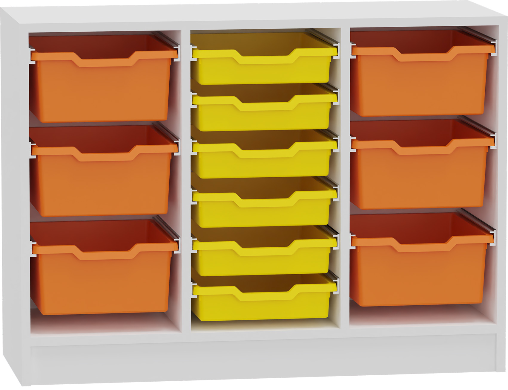 1 Regal, (Sockel oder 4 Lenkrollen, 2 davon feststellbar, 3 Fächer für 9 Kunststoffkästen (Größe IV) oder 18 flache Kästen (Größe III) oder gemischt), Kästen und Schienen bitte separat bestellen