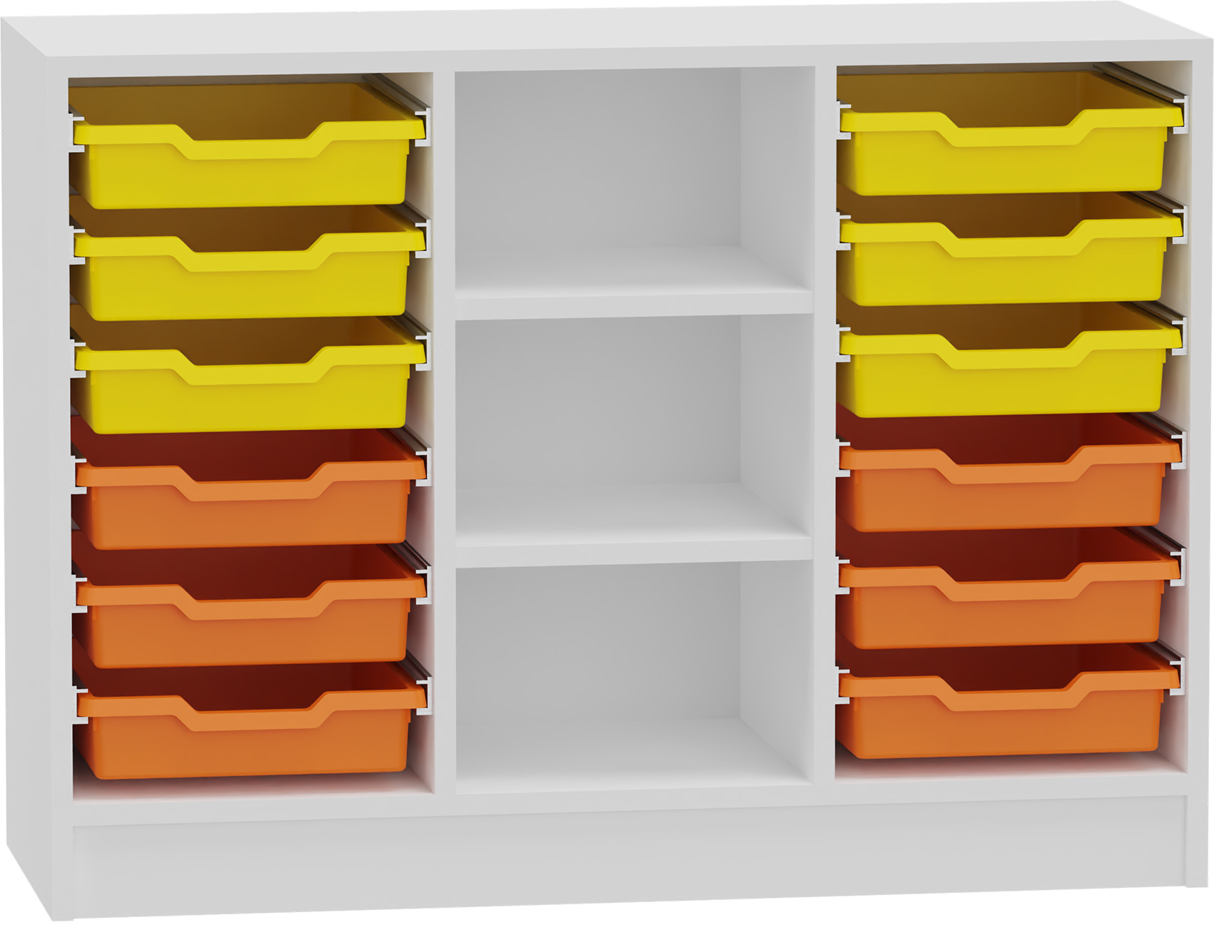 1 Regal, (3 Fächer, mittleres Fach offen mit 2 verstellbaren Fachböden, links und rechts Platz für 6 Kunststoffkästen (Größe IV) oder 12 Kästen (Größe III) oder gemischt, Sockel oder 4 Lenkrollen, 2 davon feststellbar), Kästen und Schienen bitte separat bestellen