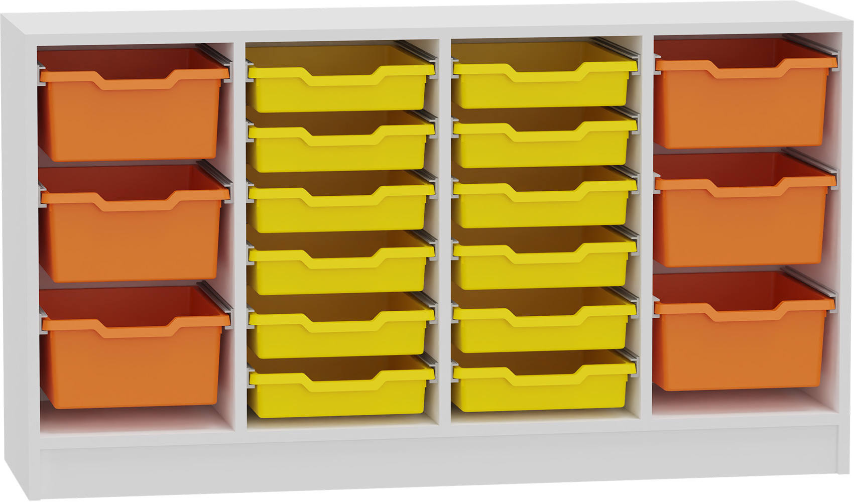 1 Regal, (Sockel oder 6 Lenkrollen, 3 davon feststellbar, 4 Fächer für maximal 12 Kunststoffkästen (Größe IV) oder 24 Kästen (Größe III) oder gemischt), Kästen und Schienen bitte separat bestellen