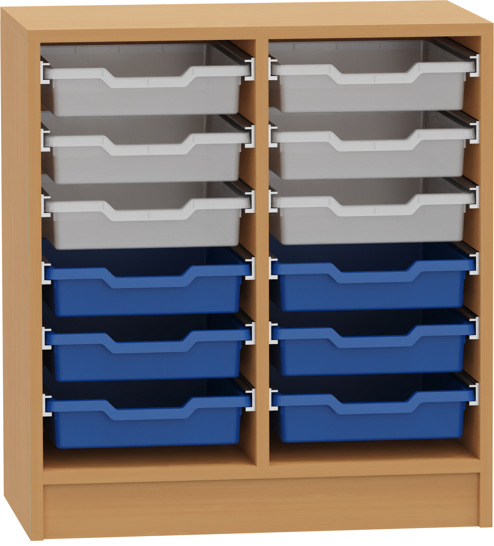 1 Regal, (Sockel oder 4 Lenkrollen, 2 davon feststellbar, 2 Fächer für 6 hohe Kästen (Größe IV) oder 12 flache Kästen (Größe III), oder 4 hohe und 4 flache Kästen oder gemischt), Kästen und Schienen bitte separat bestellen