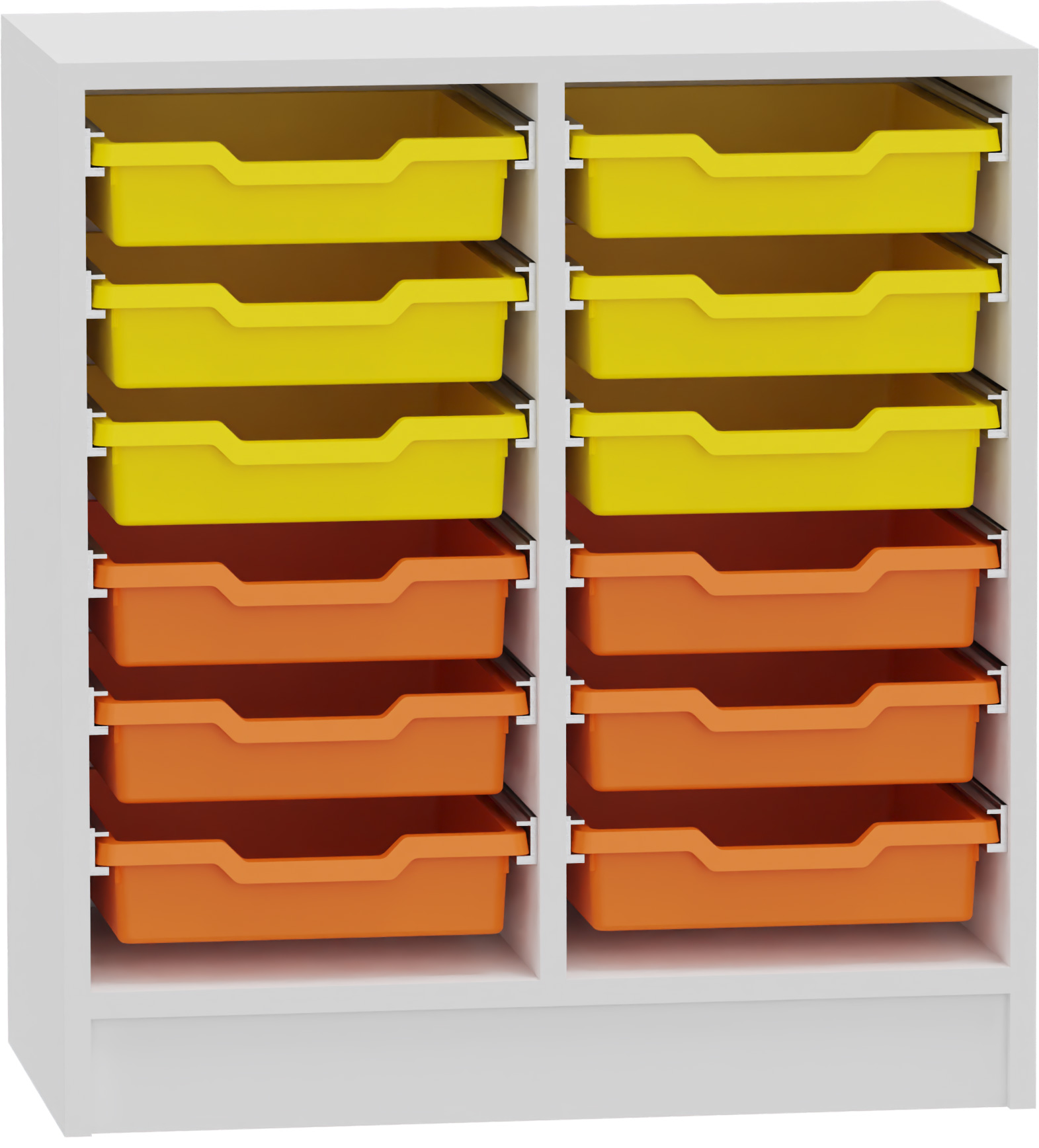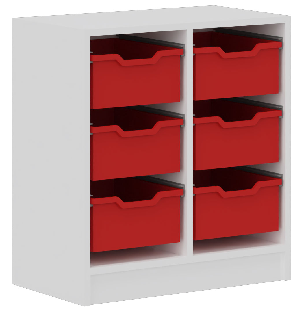 1 Regal, (Sockel oder 4 Lenkrollen, 2 davon feststellbar, 2 Fächer für 6 hohe Kästen (Größe IV) oder 12 flache Kästen (Größe III), oder 4 hohe und 4 flache Kästen oder gemischt), Kästen und Schienen bitte separat bestellen