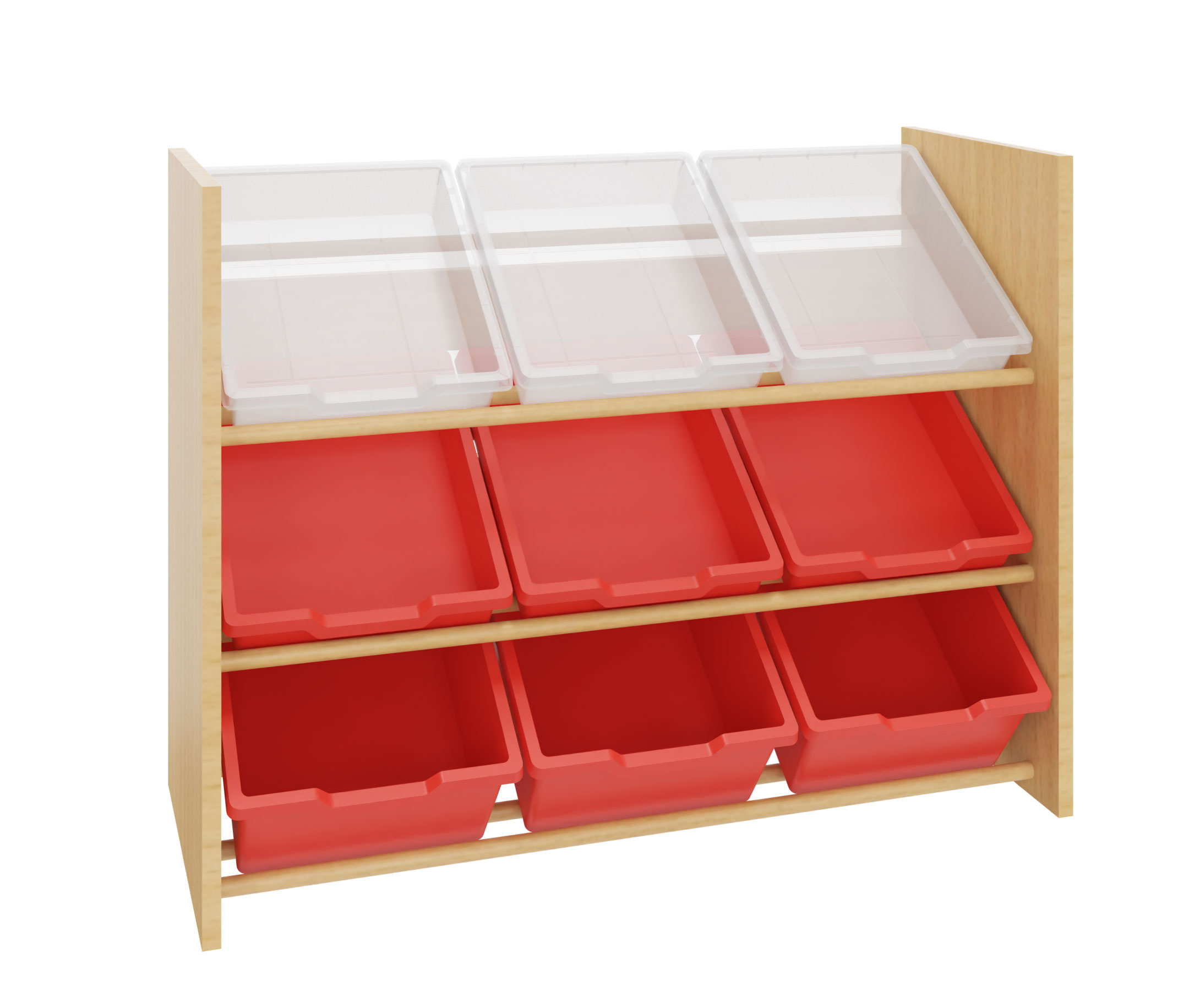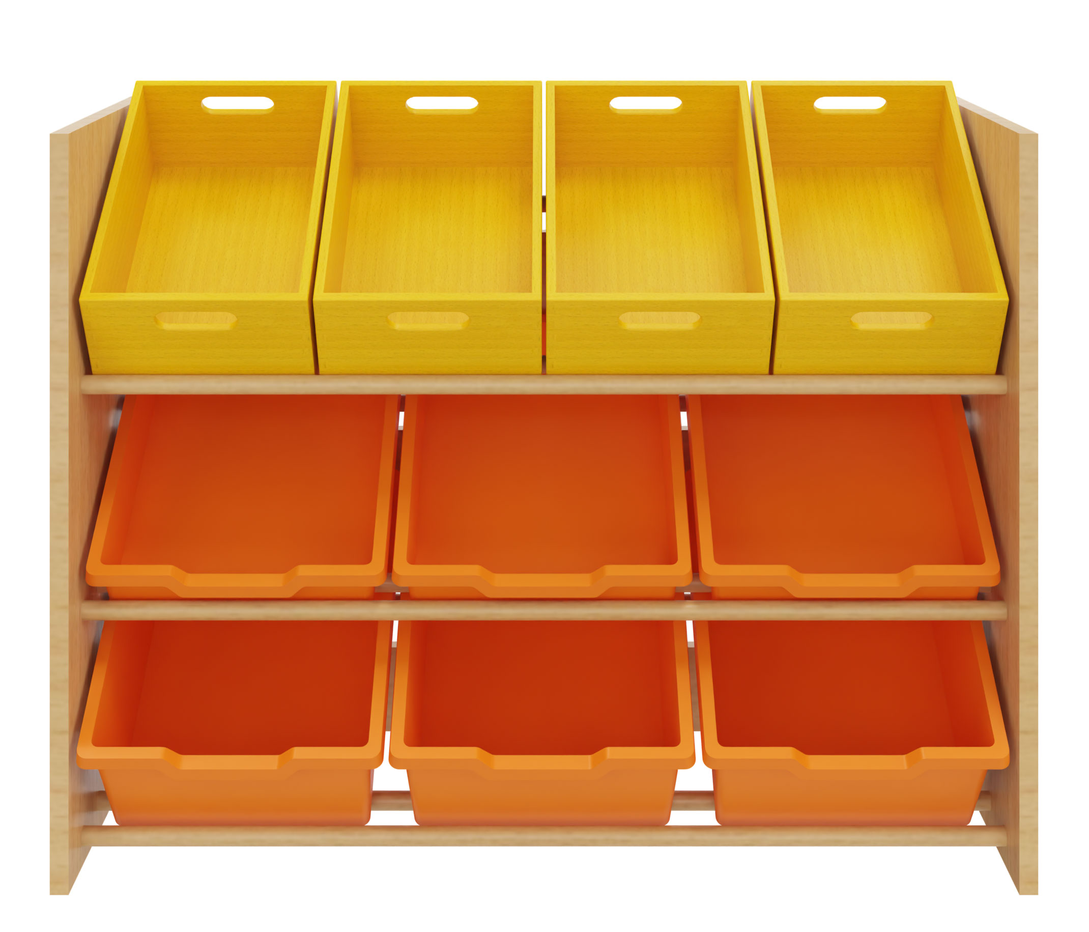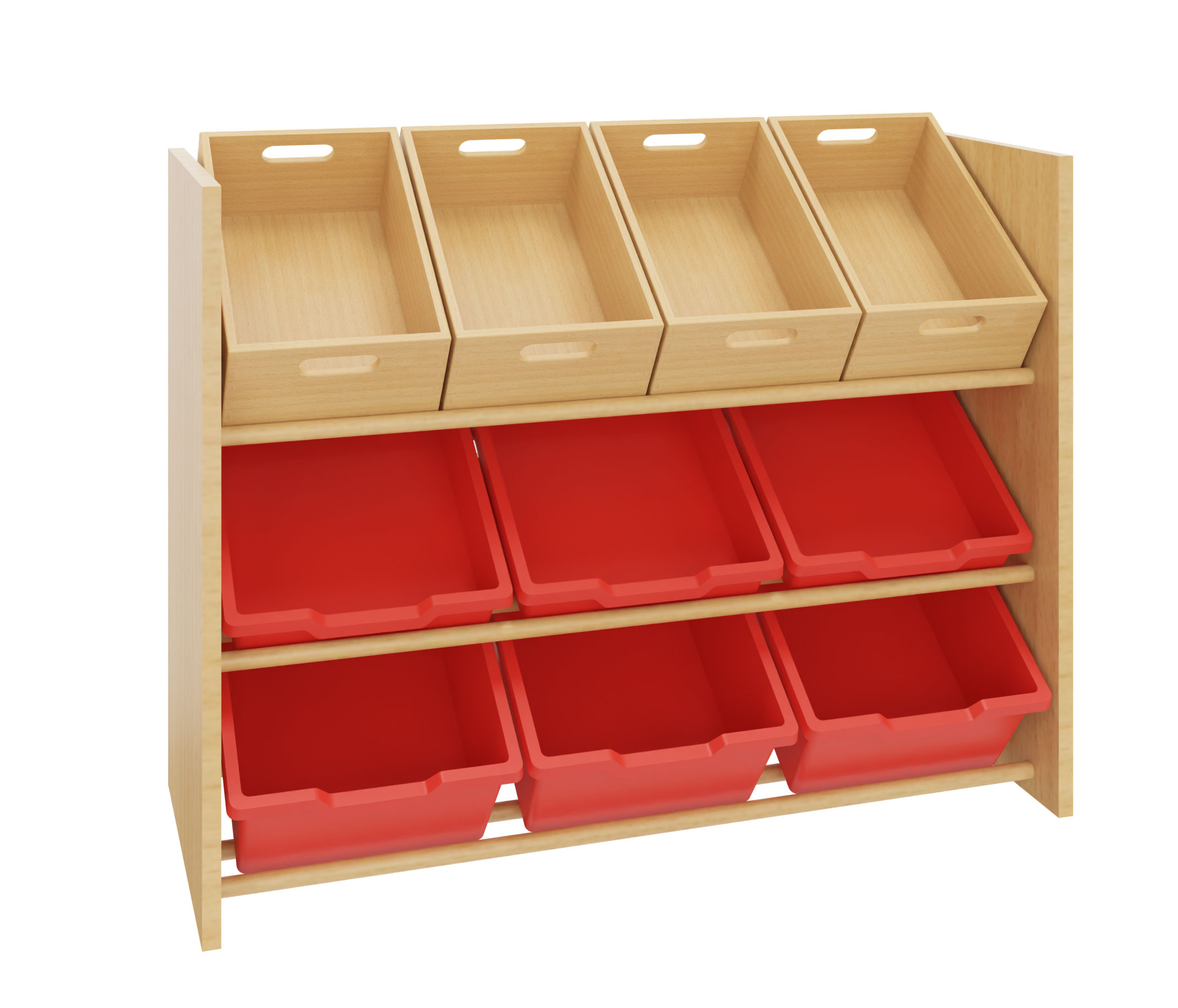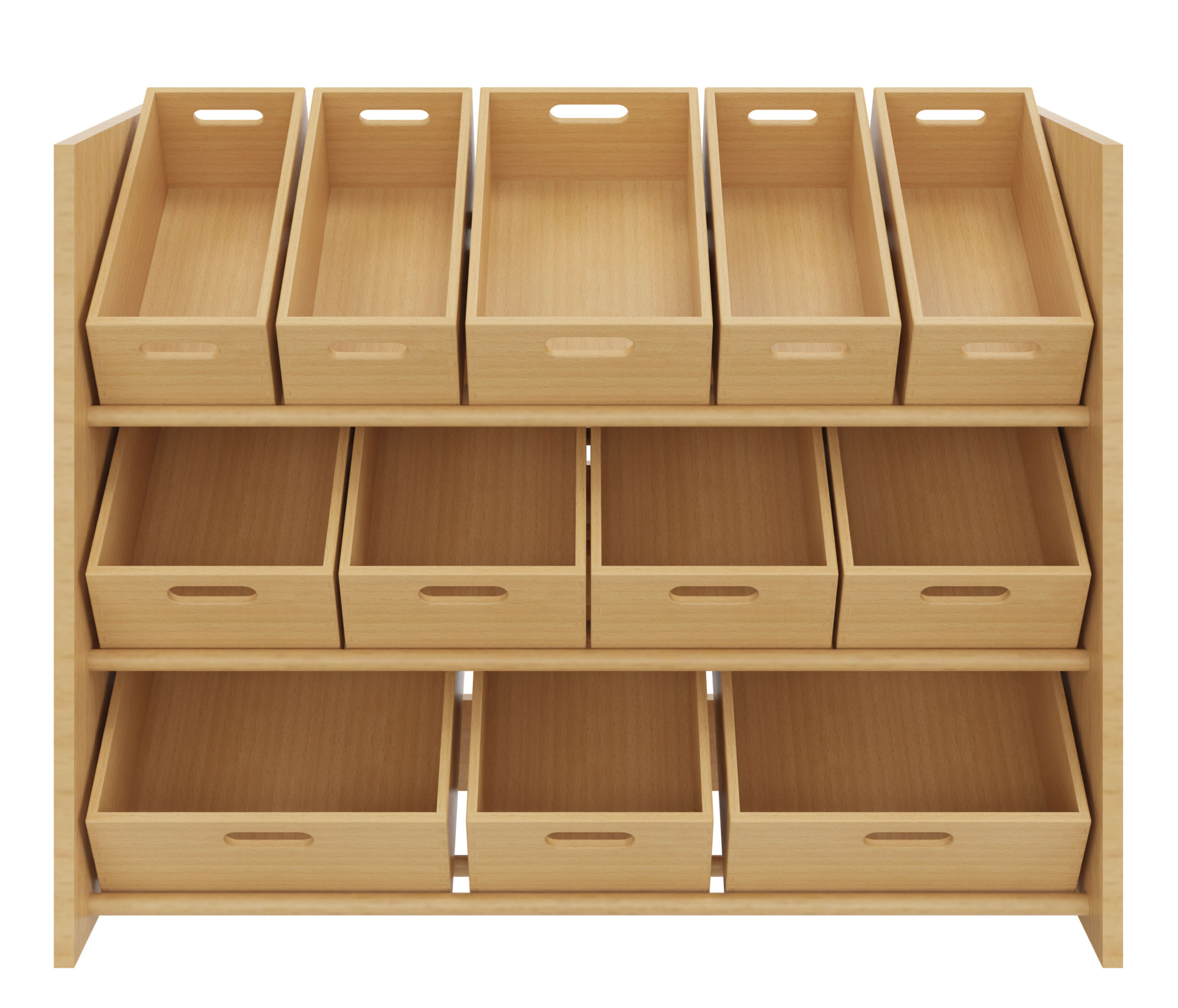 Regal zum Einstellen von bis zu 12 Materialkästen Nr. 402 100 - 402 109, 4 Stück pro Reihe oder 9 Kunststoffkästen Größe III oder IV, 3 Stück pro Reihe. Drei Reihen vorhanden.