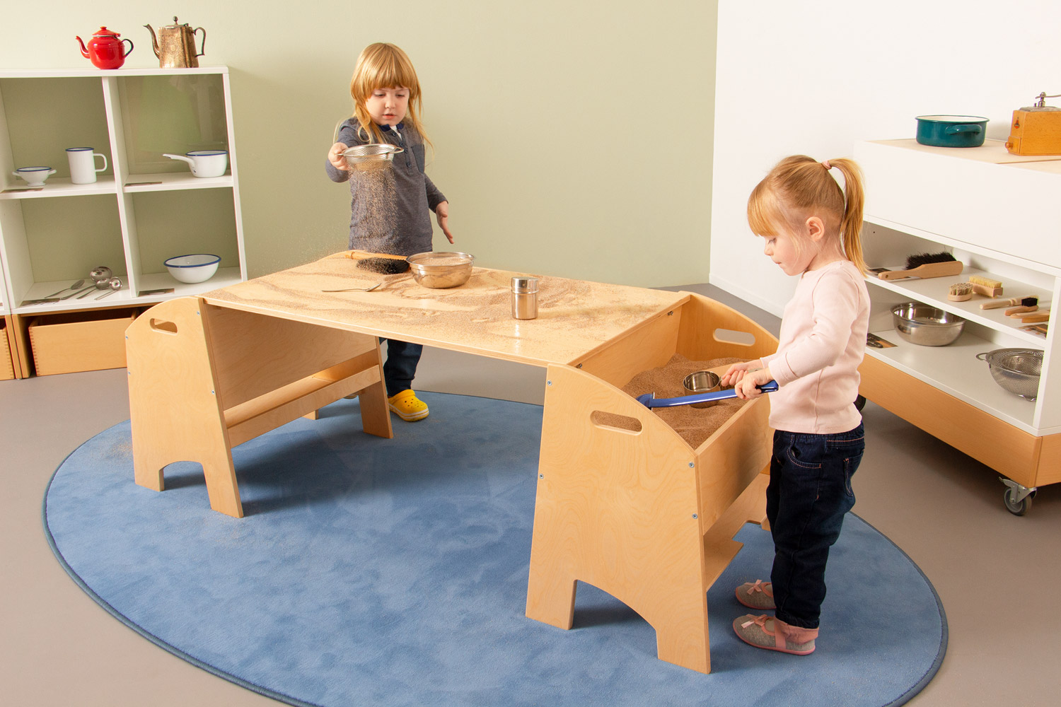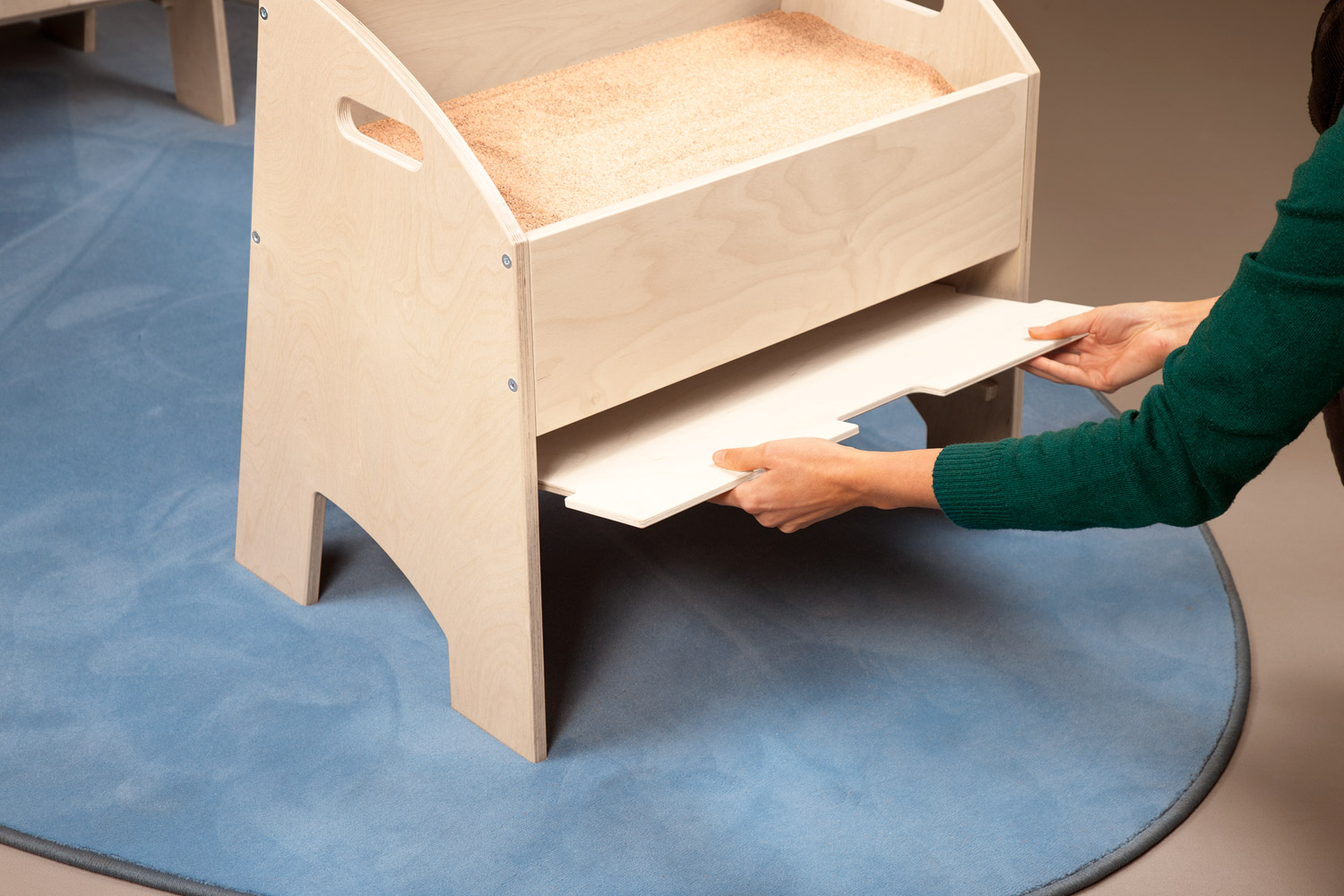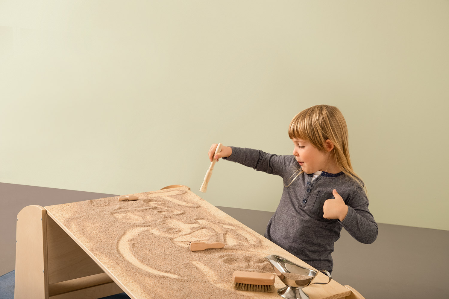 Sand ist ein faszinierendes Element. Ein lebendiges weiches Material, welches sich auch mit nur kleinen zarten Bewegungen beeinflussen lässt. Die Sandstation wurde entwickelt, um Kindern das freie Spielen und Experimentieren mit trockenem Sand zu ermöglichen. Sand lässt sich somit haptisch in einem dafür bereitgestellten Raum erfahren. Die tiefen Tröge der Sandstation ermöglichen den Kindern, mit den Armen in den Sand "einzutauchen" und sie können direkt darin arbeiten. Auf der Arbeitsplatte lässt sich der Sand ausbreiten. Mit zusätzlichen Materialien wie Bürsten (102 382) oder unterschiedlichen Schütt- und Siebematerialien (102 383) kann der Sand gesiebt, gefegt, gelöffelt, geschüttet und sogar damit gemalt werden. Die Deckel lassen sich unten in die Tröge einstecken. Bei der Sandstation Kindergarten können diese somit auch als Ablage für weitere Materialien verwendet werden. Ist das Spiel beendet, wird der Sand zurück in die Tröge gefüllt und diese mit den Deckeln abgedeckt.