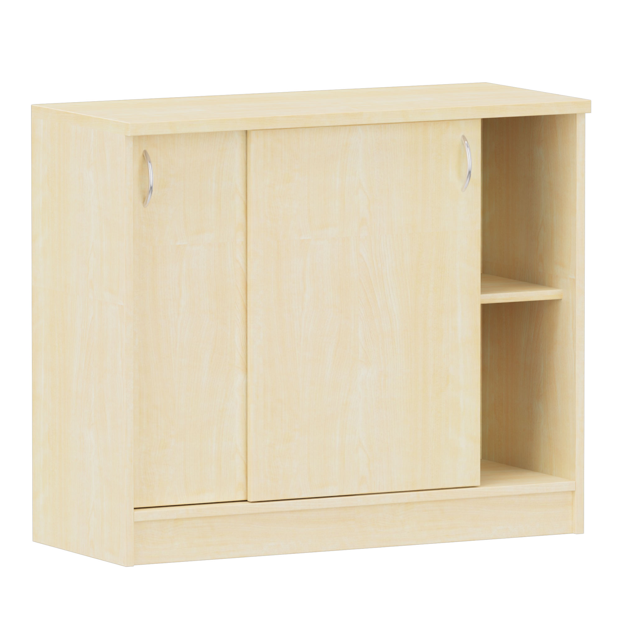 Leichtgängige Schiebetüren, dahinter 1 verstellbarer Fachboden (für 2 Ordnerhöhen) bei 85 cm Höhe, 2 verstellbare Fachböden (für 3 Ordnerhöhen) bei 146 cm Höhe. Bogengriff Nickel, matt.