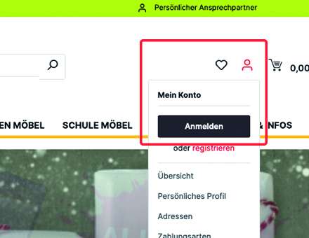 Klicke auf das Männchen im oberen rechten Bereich des Online-Shops um dich im "MEIN KONTO"-Bereich anmelden zu können.