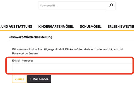 Tippe hier deine E-Mail-Adresse ein mit der du dich in unserem alten Online-Shop registriert hast. Innerhalb weniger Minuten solltest du eine E-Mail zur Zurücksetzung deines Passwortes erhalten - falls nicht, schau doch auch einmal in deinen SPAM-Ordner nach.