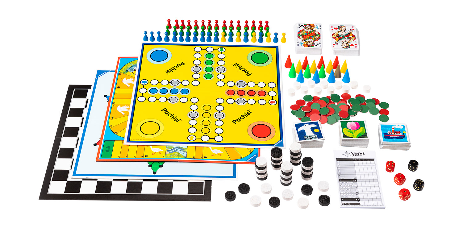 | Inhalt: | 4 Doppelspielpläne, 50 Spielfiguren (Holz), 11 Sperrsteine (Holz), 17 Fang den Hut®Hütchen, 40 Damesteine (Holz), 65 Reversi®Spielsteine, 48 Bildkärtchen für memory®, 5 Würfel (Holz), 110 Spielkarten (Rommé, Poker), 1 YatziBlock, inklusive 1 Spielanleitung |