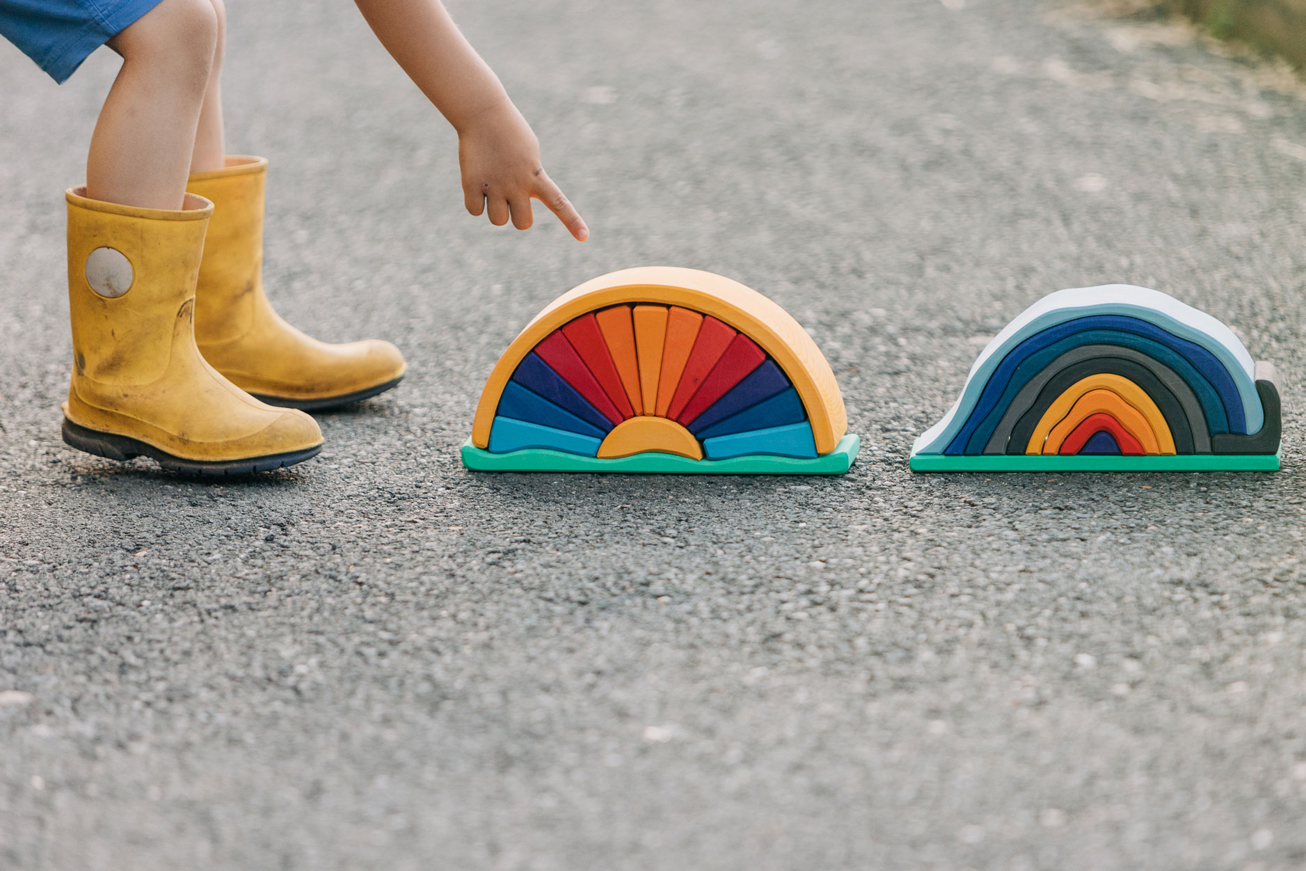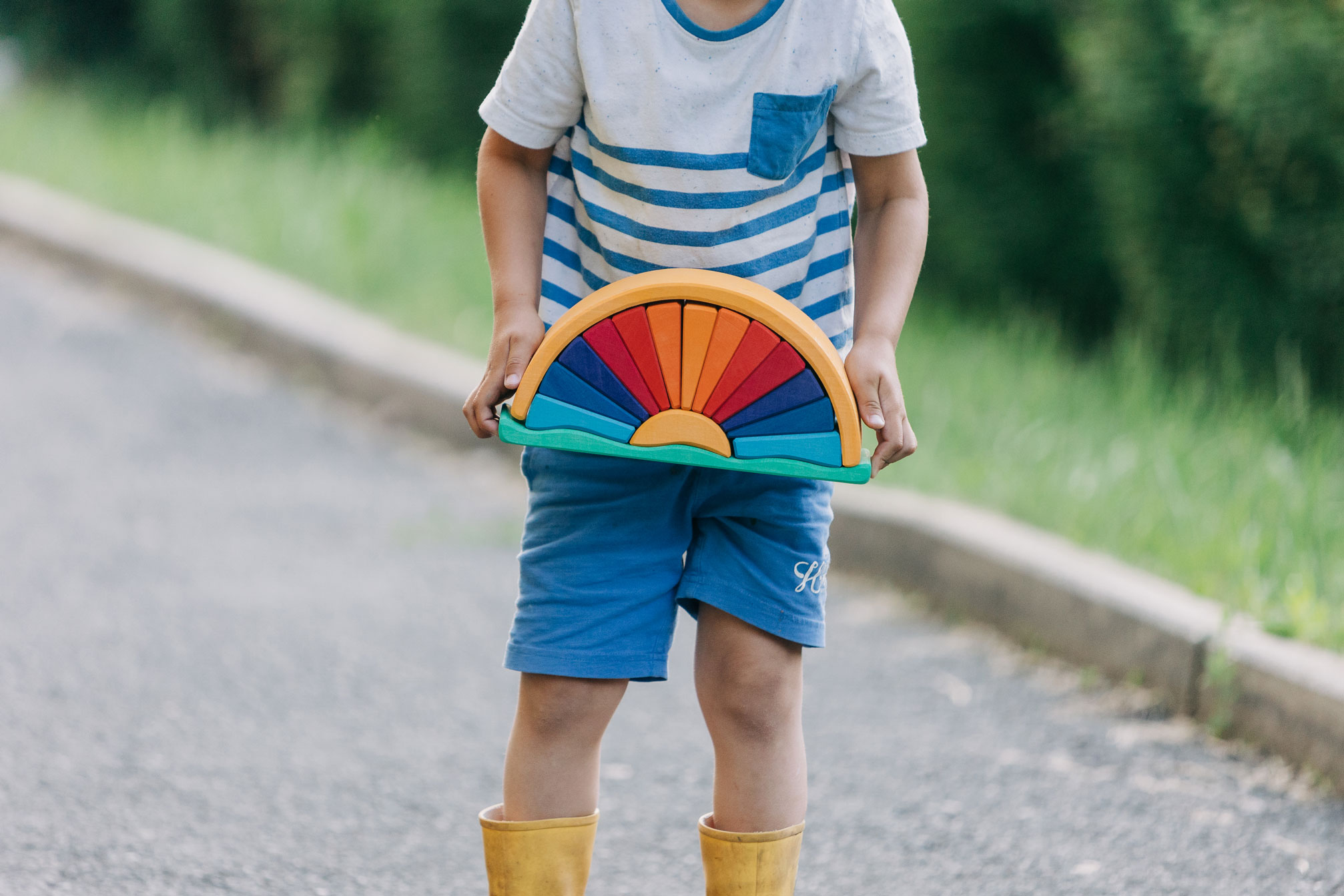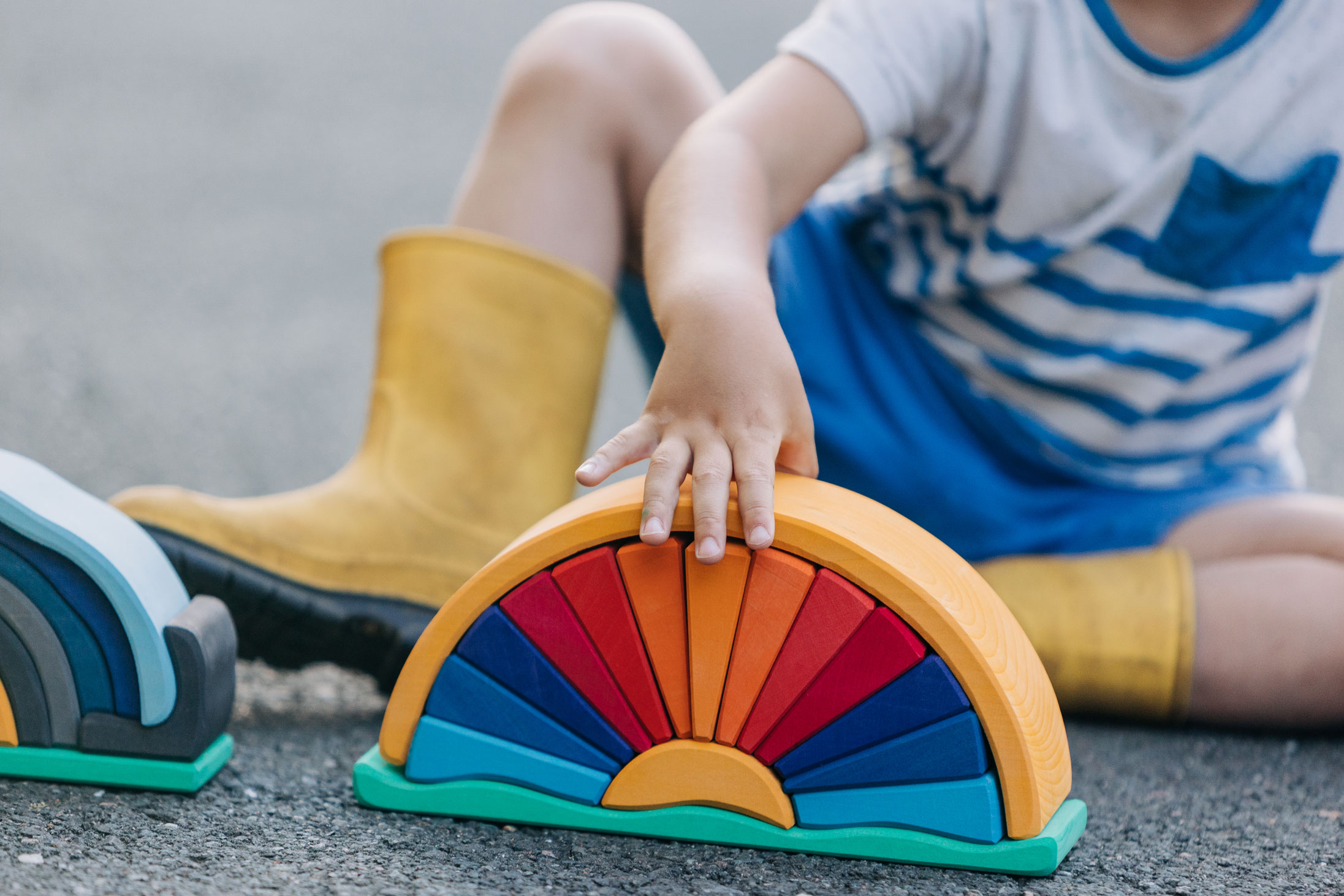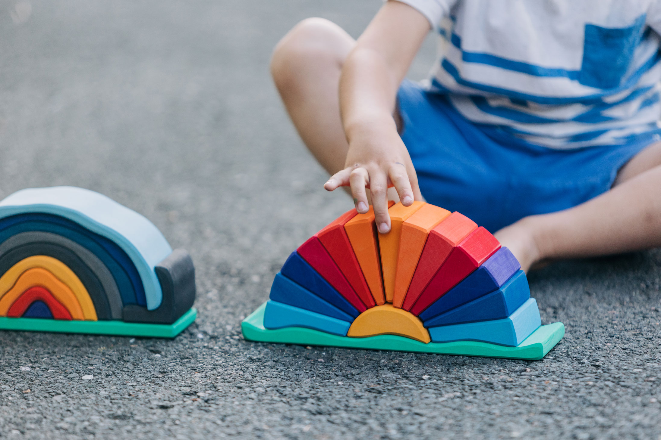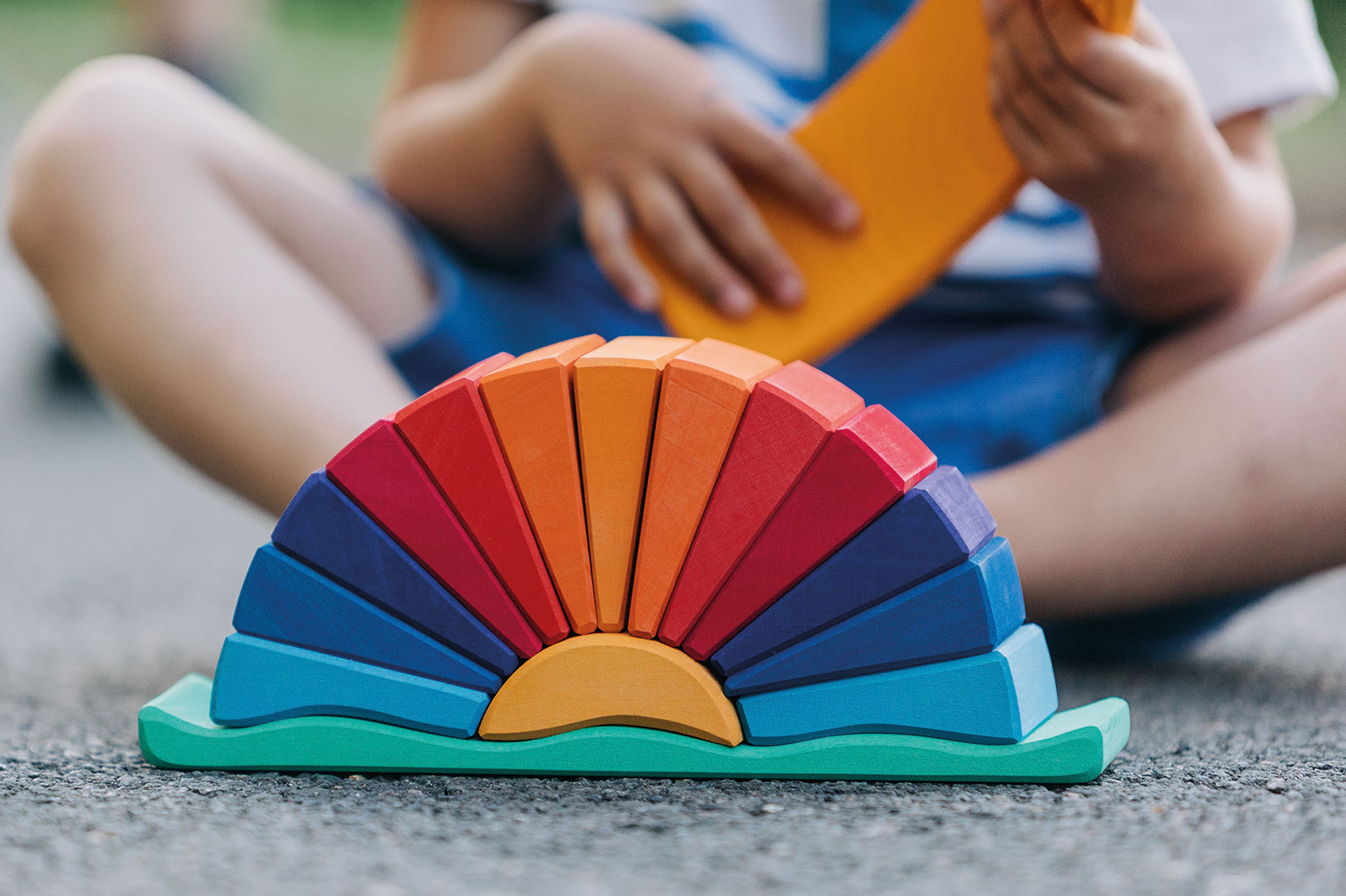 Wenn die helle Sonne am Horizont auf- oder untergeht, entsteht ein staunenswertes Farbenspiel. Die intensive Färbung des Strahlenbogens in Gelb-, Orange- und Rottönen, die wir vor allem zum Sonnenuntergang im Sommer erleben dürfen, sind von zauberhafter Schönheit. Und es braucht die Ruhe, solche Momente – wenn wir sie bewusst erleben dürfen – ganz aufzunehmen. Dann erleben wir manchmal etwas wie ein innerliches Ausatmen, ein Loslassen von der Last des Tages und ein harmonisches Eintauchen in die Schönheit der Welt, in der wir leben. Das wunderschön gestaltete Holzspielzeug trägt die leuchtend-warmen Farben der untergehenden Sonne und zugleich die der sommerlich-blauen Nachthülle in sich. Die einzelnen Holzbögen des Formenspiels dürfen ganz freilassend und kreativ ins Spiel der Kinder hineinfinden – ob als Sonnenstrahlen oder in einem ganz anderen Kontext. Hochwertige, sorgfältig hergestellte Holzbausteine und Formenspiele aus guten Naturmaterialien sind ein pädagogisch sehr wertvolles und zeitloses Holzspielzeug für Kinder. Im fantasievollen, ruhigen Spiel der Kinder kann so aus den freien Formen immer Neues entstehen. Ganze Spielewelten, die zusammen mit Holztieren, Figuren und Püppchen, Dekorationstüchern und Naturmaterialien ausgebaut und kreativ erschaffen werden. Entgegen den Spielzeugen, denen ein fester Spielsinn bereits eingeschrieben ist, wird hier das Freie im Spiel der Kinder pädagogisch sanft gefördert und so dem kraftvollen Impuls des Erschaffens aus der eigenen Fantasie Raum gegeben. In diesem Rahmen ist es auch so wichtig, dem Spiel der Kinder den notwendigen Raum und die Ruhe zu gewähren. Nur wo Kinder ganz eintauchen können in ihr Schaffen, kann sich die große Kraft des kindlichen Spiels ganz entfalten. Und unsere Kinder in ihrer Entwicklung stärken und festigen. Und wenn einmal die Zeit gekommen ist, in der Kinder die ersten Holzspielzeuge hinter sich lassen, so sind die wunderschön gestalteten Formenspiele auch im Regal oder einem anderen geeigneten Platz eine warme, liebevolle Reminiszenz an die frühe Kindheit. Und erfreuen das Auge der Betrachtenden durch ihre wohltuende Farbgestaltung und harmonische Formgebung.