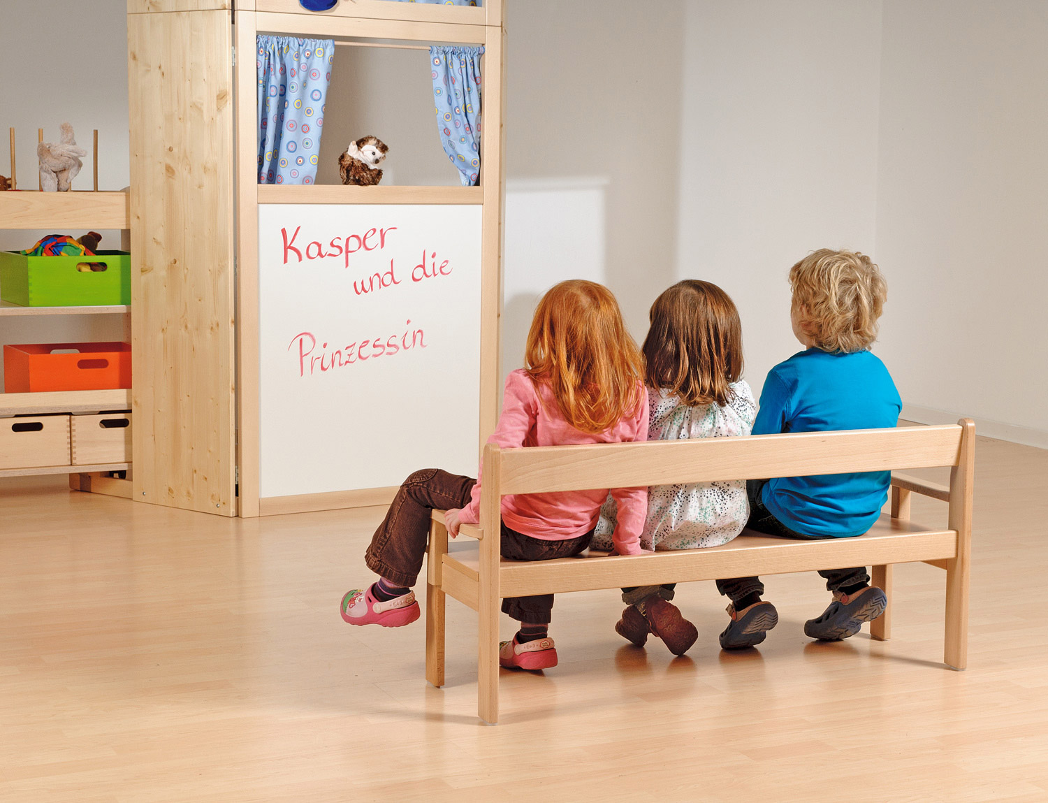 Vorhang auf fürs Puppenspiel! Als Tischtheater mit einer märchenhaften Spielszene aufgebaut, mit Marionetten von oben bespielbar, oder als Kasperltheater in Erwachsenenhöhe, dieses zweiteilige Theater lässt sich für fantasievolle Inszenierungen einsetzen. Das durch Holzdübel verbundene, abnehmbare Oberteil ist als Marionetten- und Tischtheater zu verwenden. In Kombination mit dem Unterteil entsteht ein Kaspertheater in Erwachsenenhöhe. Das Unterteil von 135 cm Höhe und Spielhöhe von 90 cm ermöglicht es den Kindern, in einer ihrer Körpergröße angepassten Höhe zu spielen. Die weiße Vorderfront ist mit wasserlöslichen Stiften beschreibbar. Die beiden 40 cm breiten Seitenteile sind in verschiedene Winkel klappbar und werden durch den in der Bühnentiefe variierbaren Kulissenstab fixiert. Die Seitenteile sind komplett zurückklappbar, so dass das Theater platzsparend verstaut werden kann. Die nach vorne ausladenden Füße machen das Theater kippsicher.