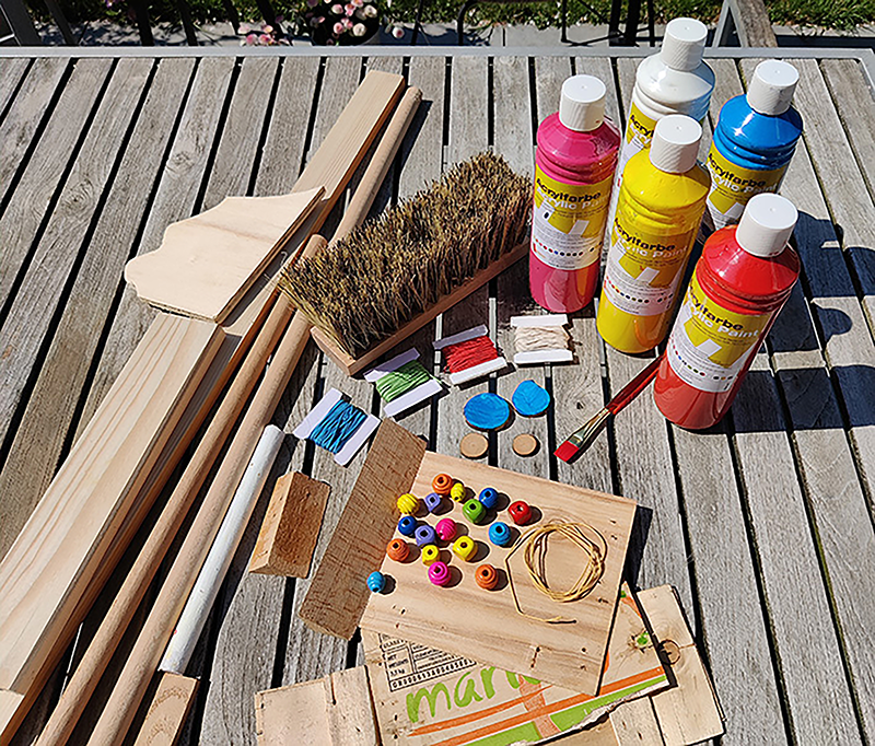Nimm ein flaches Stück Holz (z. B. 20–25 cm lang). Bemale es farbenfroh. Bohre 9 kleine Löcher nebeneinander durch das Holzstück. Fädle in jedes Loch ein Rundriemchen oder eine stabile Schnur.