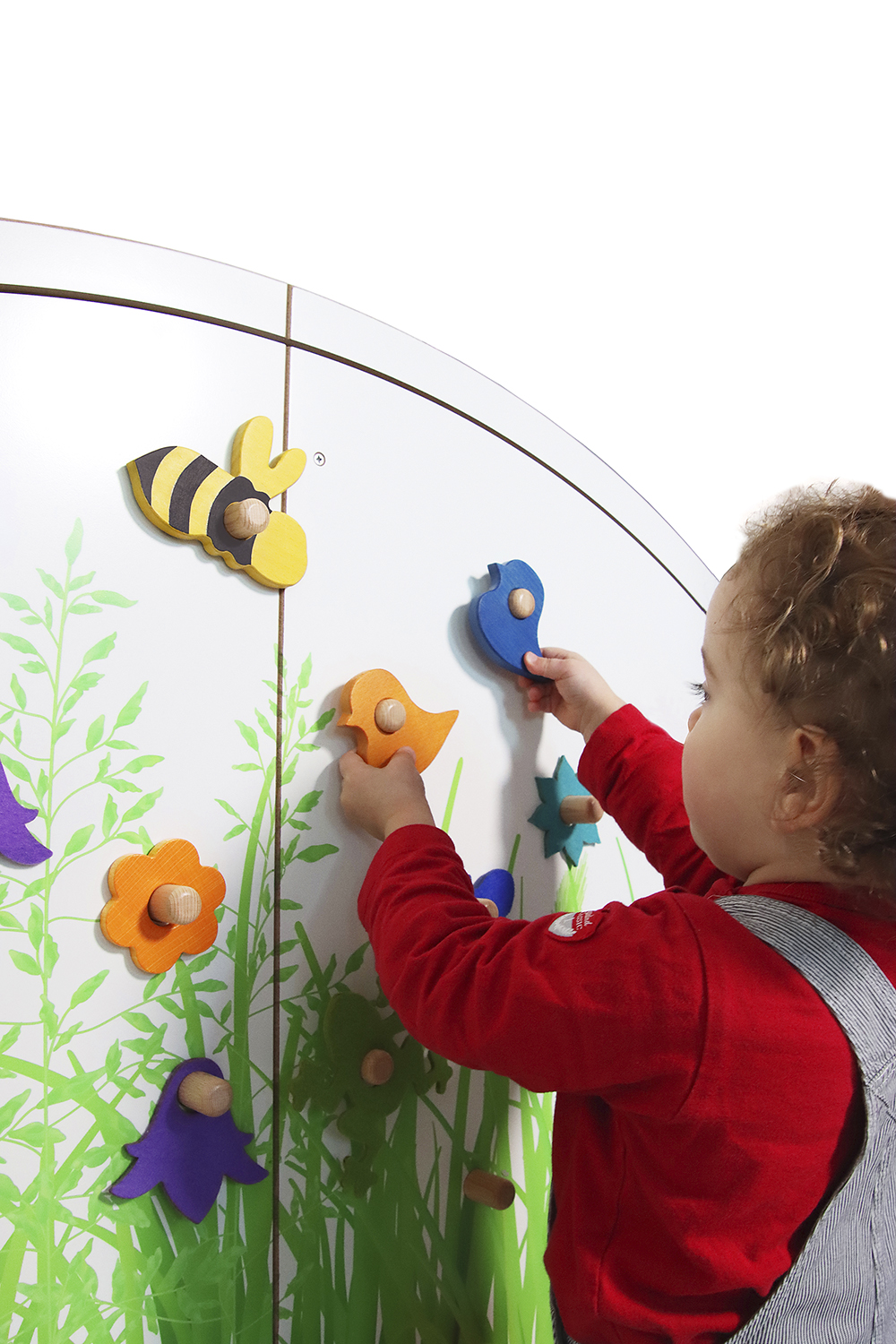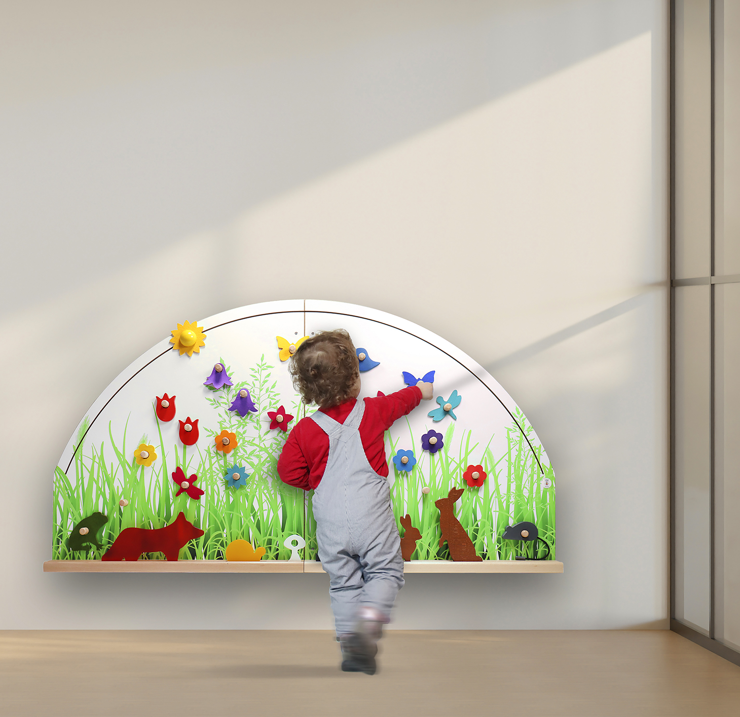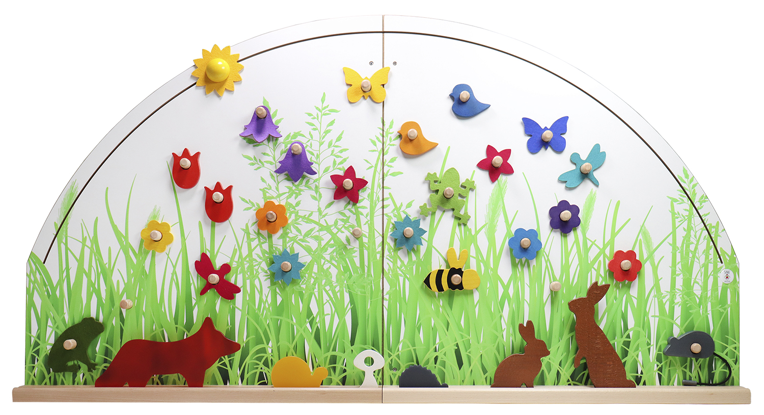 Die Krabbelwiese erzählt täglich eine neue Geschichte. Wie viele Blumen blühen heute auf der Wiese? Springt der Frosch heute von Blatt zu Blatt? Welche Tiere machen heute ein Wettrennen? Wer ist schneller? Sitzt die Libelle auf einem Grashalm oder fliegt sie durch die Lüfte? Wo steht die Sonne gerade? Ist sie erst im Osten aufgegangen oder geht sie bald schon unter?