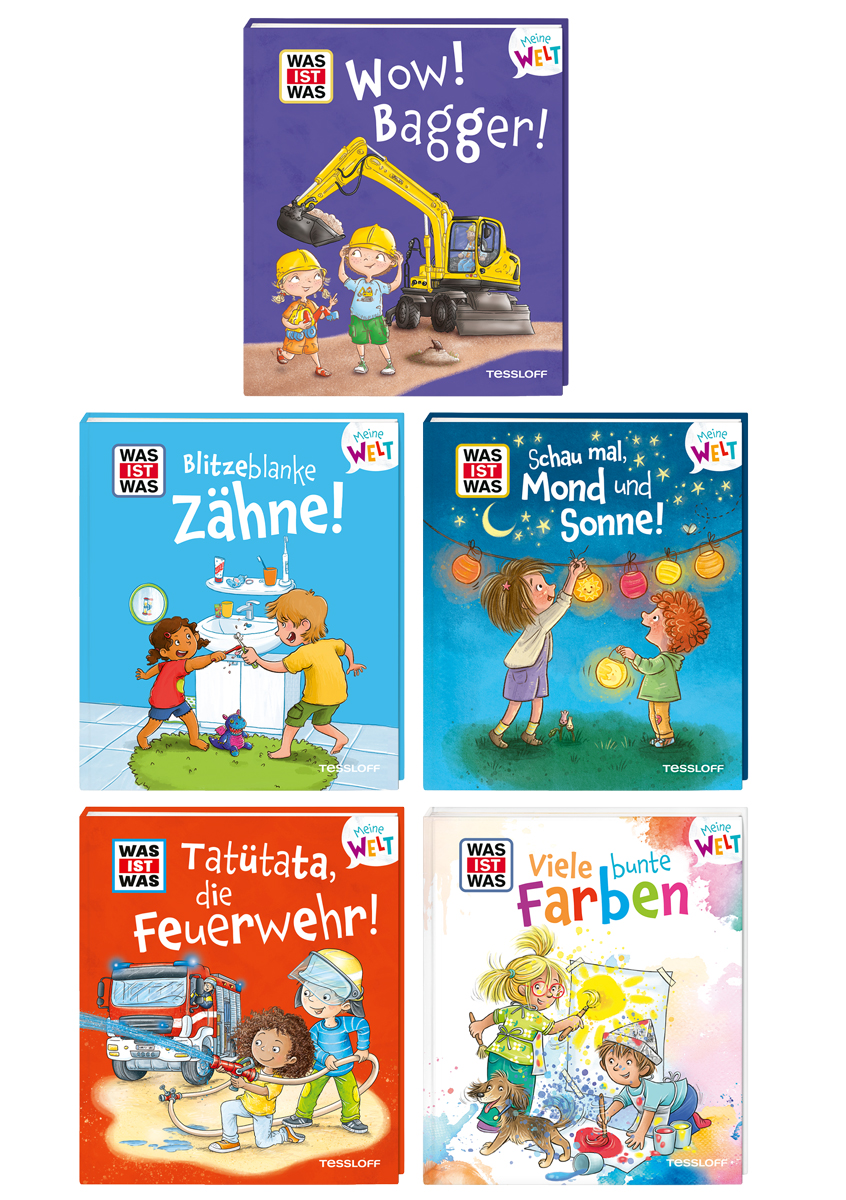 Je 5 Titel im Set, (Tatütata, die Feuerwehr ist da!, Viele bunte Farben, Wow! Bagger!, Schau mal, Mond und Sonne!, Blitzeblanke Zähne!)