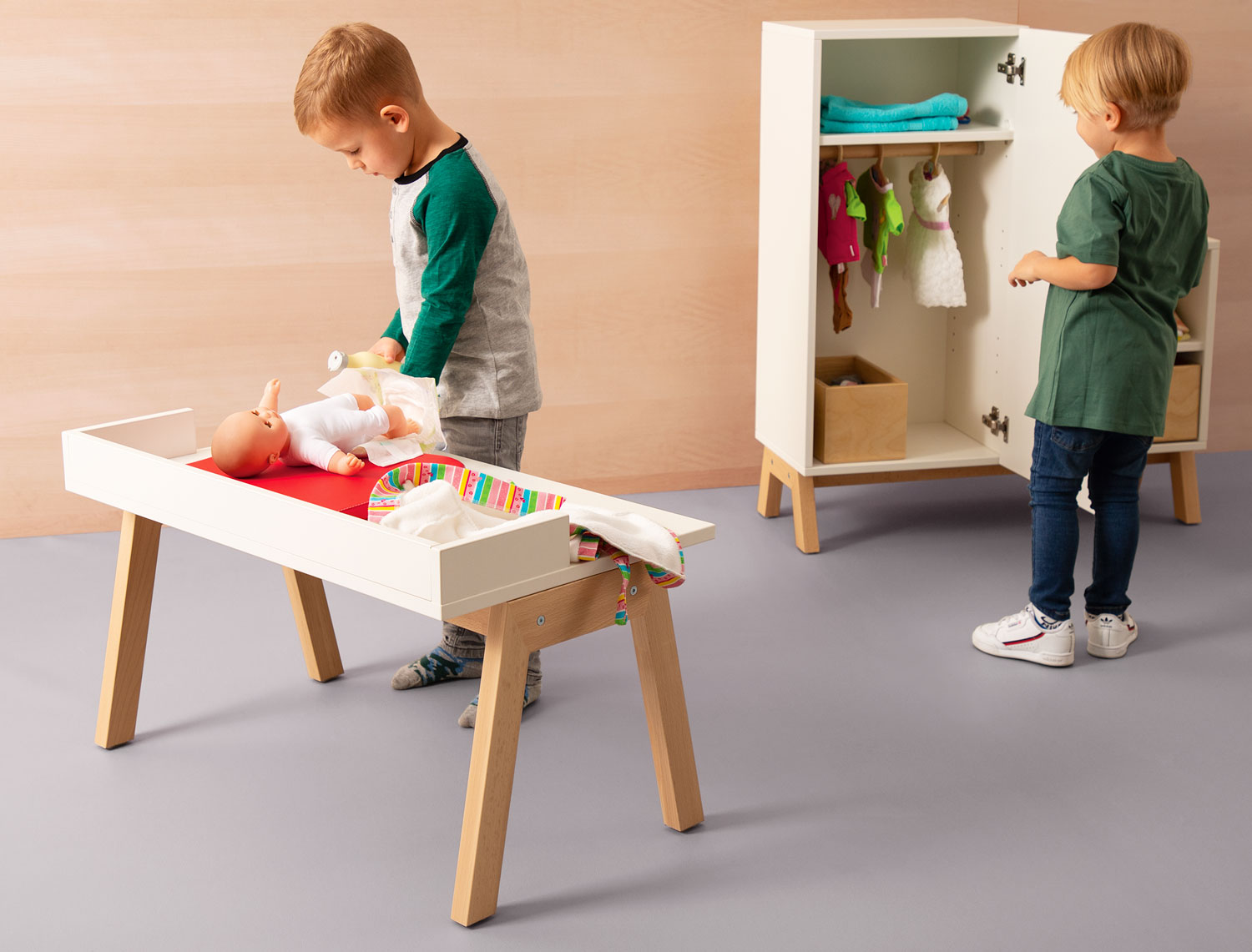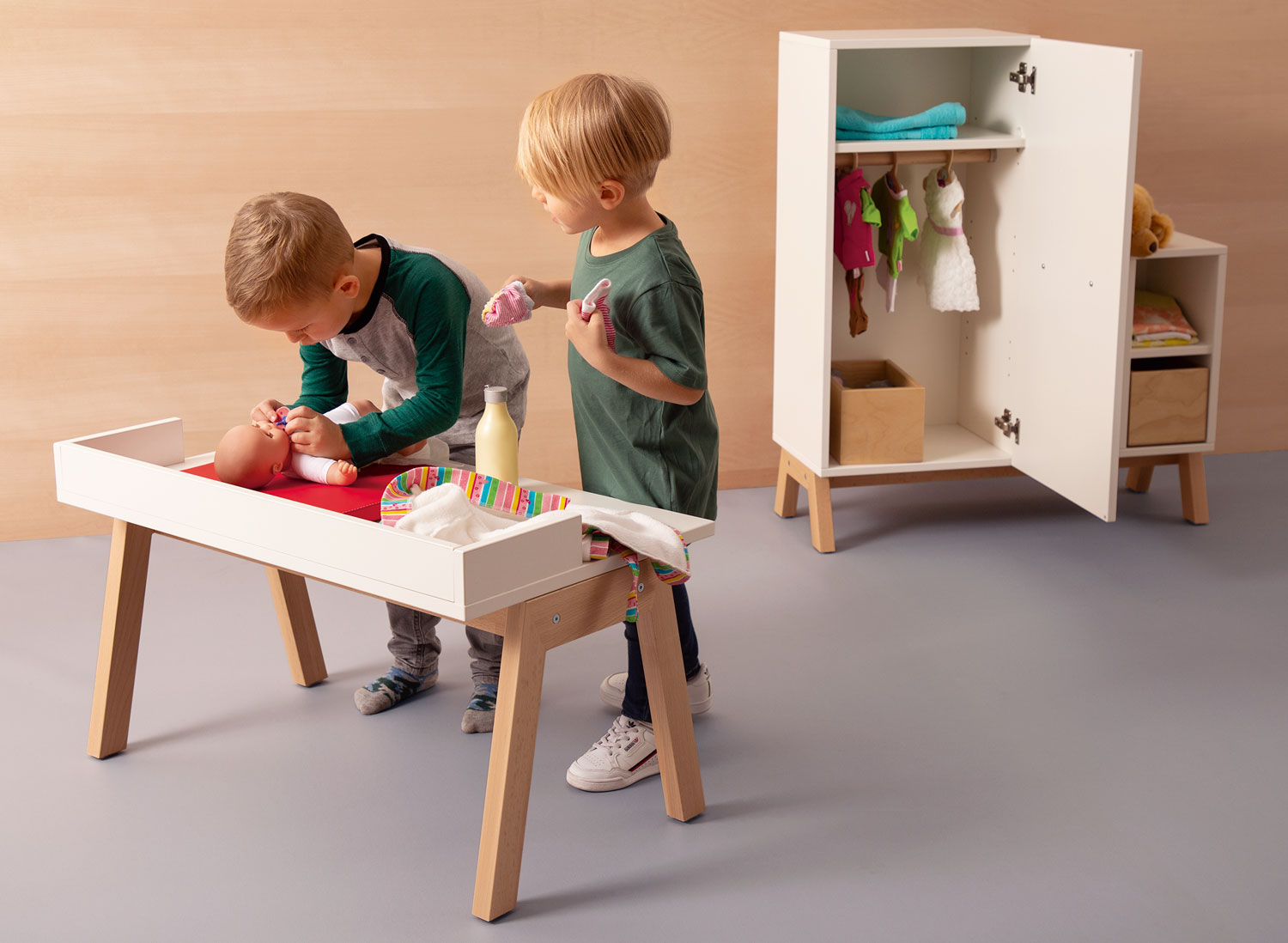 kowidu – Die Rollenspielmöbel lassen sich je nach Anforderungen kombinieren und zusammenstellen. Ob verschiedene Küchenvarianten, den passenden Esstisch, Hocker oder Sitzbank, selbst Frisiertisch und Sekretär finden sich im Möbelprogramm kowidu.