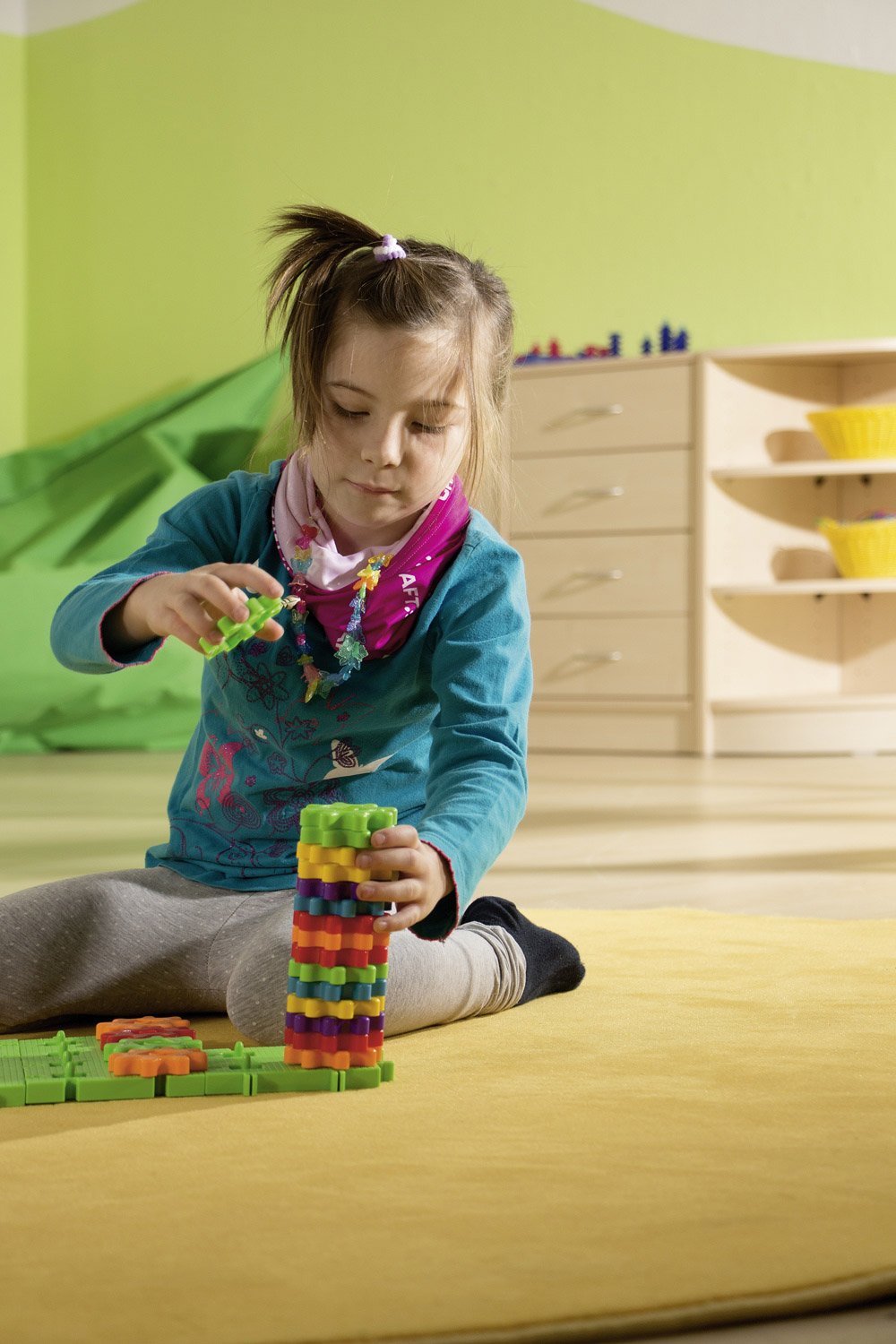 Schon kleine Kinder lösen intuitiv schwierige, konstruktive Probleme und erzeugen kleine, sich drehende, farbenfrohe Meisterwerke. Mit farbigen Teilen wie Zahnrädern, Verbindungen und Grundplatten bestehen unzählige Möglichkeiten, dreidimensionale, bewegte Konstruktionen zu erfinden. Die Teile sind in einem großen Eimer untergebracht.